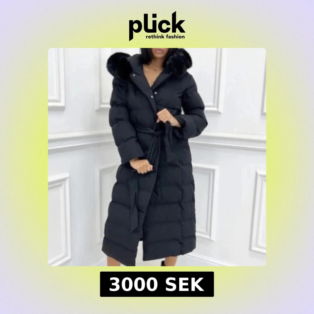 Säljer en svart lång dunjacka med stor huva och fuskpälsdetaljer. Jackan har bälte i midjan, knappar framtill och är quiltad för extra värme. Perfekt för kalla vinterdagar och ger en riktigt snygg siluett.
