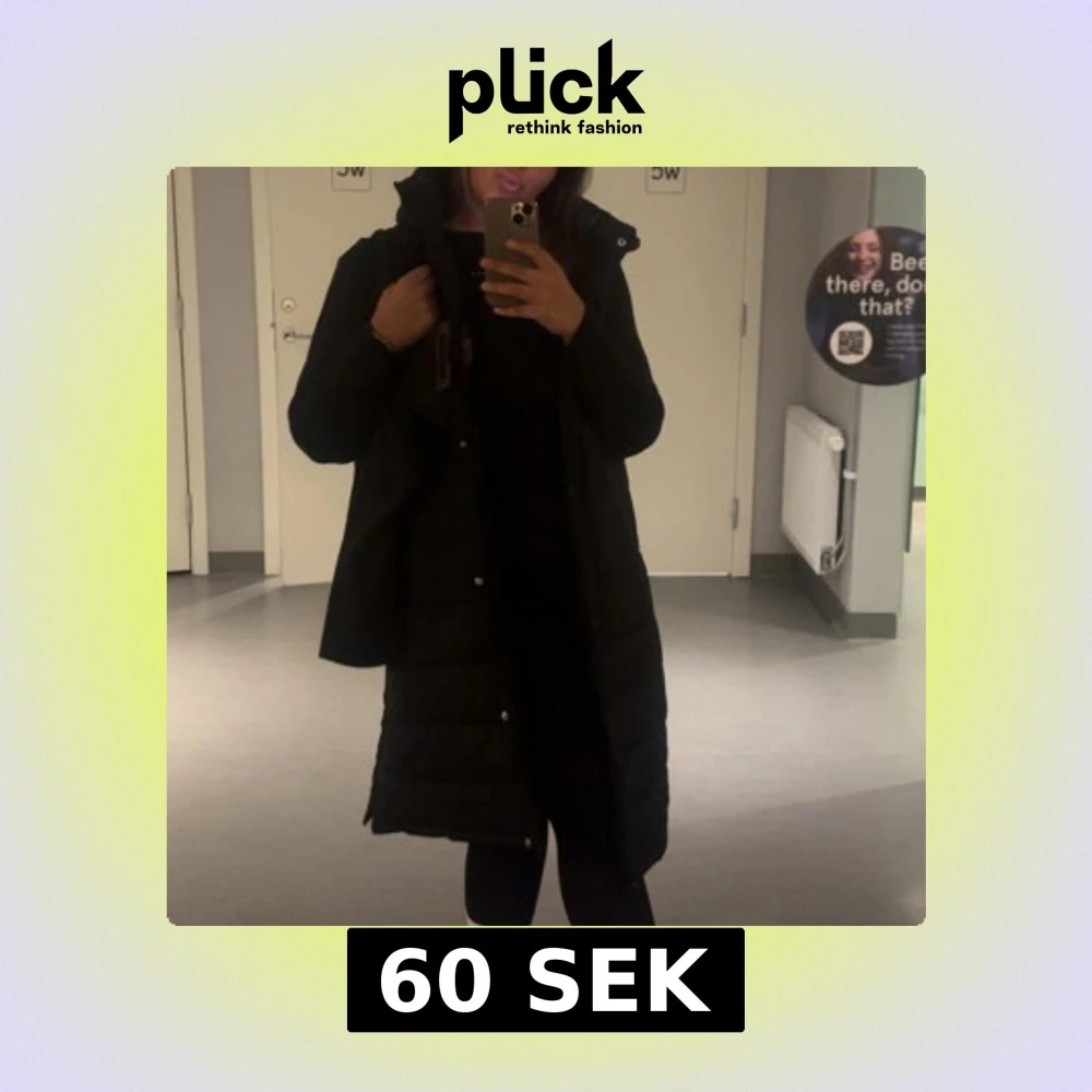 Säljer en svart lång dunjacka med huva och hög krage. Jackan har quiltad design och stängs med både dragkedja och knappar.