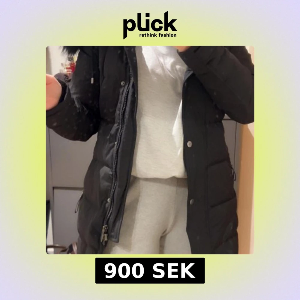Säljer en svart dunjacka med huva och snyggt pälskant. Jackan är lång, har dragkedja och knappar framtill samt praktiska fickor på sidorna. Perfekt för kalla dagar och har en stilren look som funkar till allt.