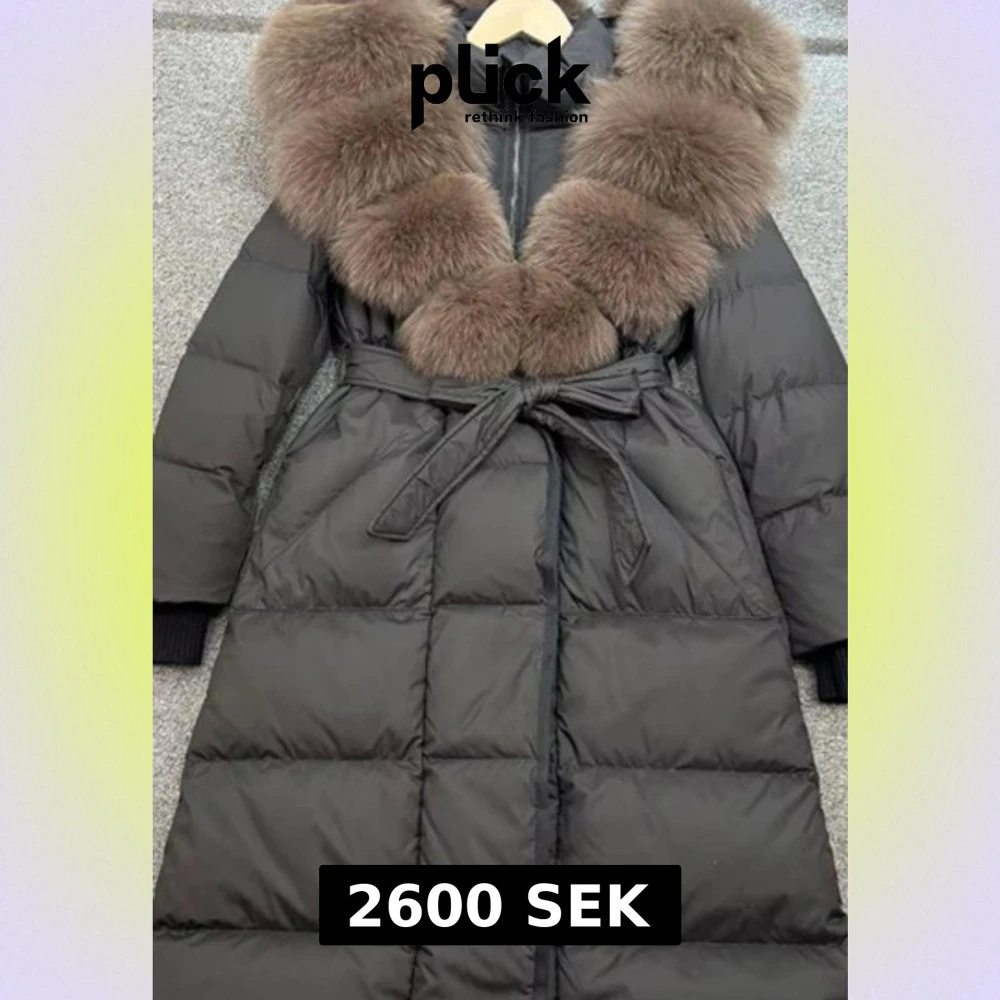 Snygg svart lång dunjacka med fluffig brun päls runt kragen och ett bälte i midjan. Jackan har quiltad design, dragkedja framtill och långa ärmar med ribbade muddar. Perfekt för kalla dagar när du vill vara både varm och stilren.