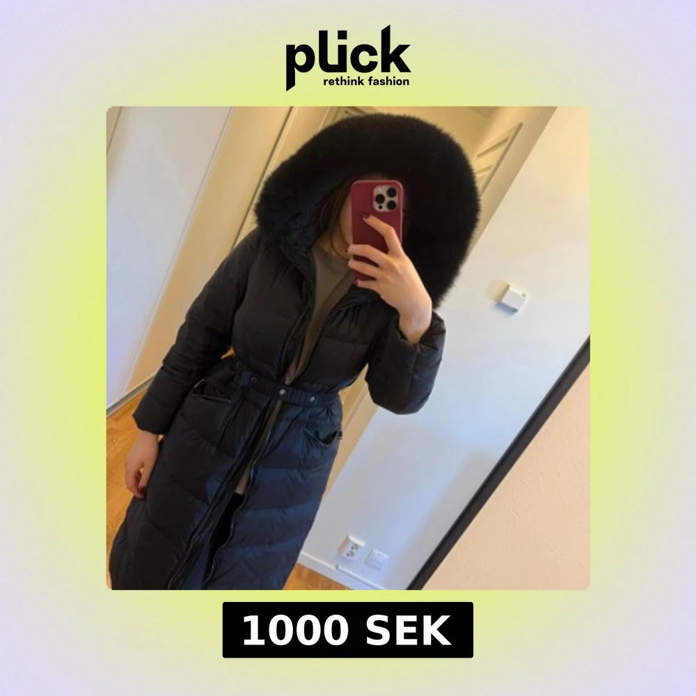 Snygg svart lång dunjacka med pälsdetalj på huvan och bälte i midjan. Jackan har dragkedja framtill och långa ärmar, perfekt för kalla dagar. .