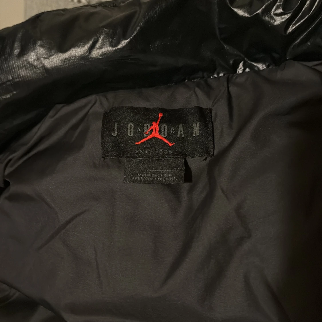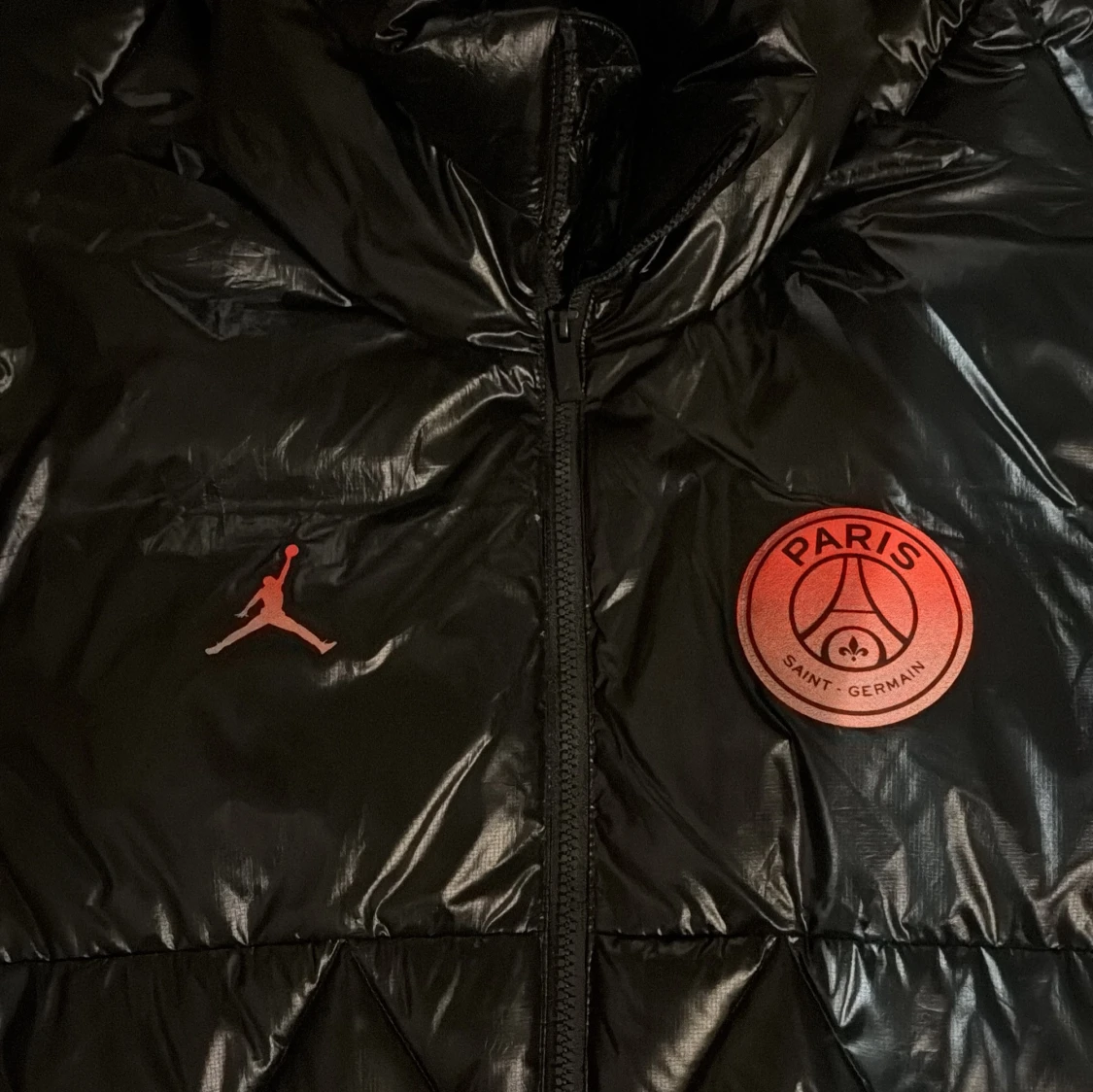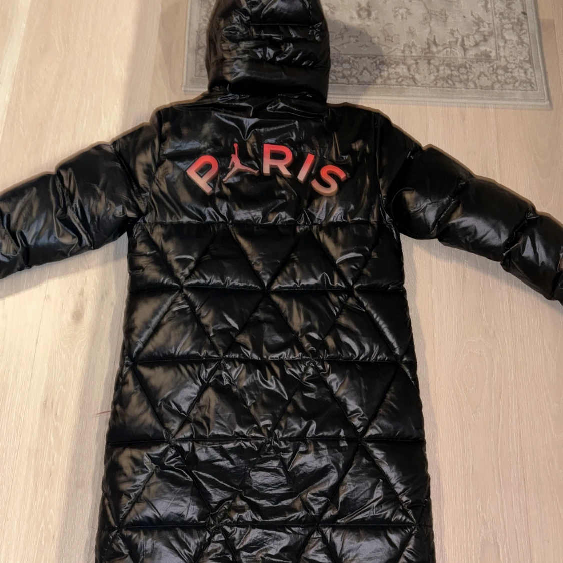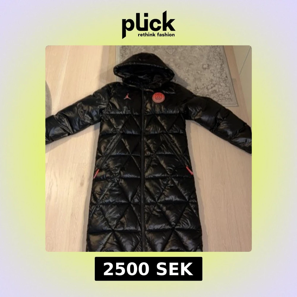 Lång svart dunjacka från Jordan x PSG med glansig finish, quiltat mönster och huva. Jackan har dragkedja framtill, röda detaljer och Paris Saint-Germain-logga på bröstet samt stor PARIS-tryck på ryggen. Perfekt för kalla dagar och streetstyle. Storlek s men stor i storleken. Jag är 176 och den är i min åsikt för lång på mig. Ny pris 5000 från zalando
