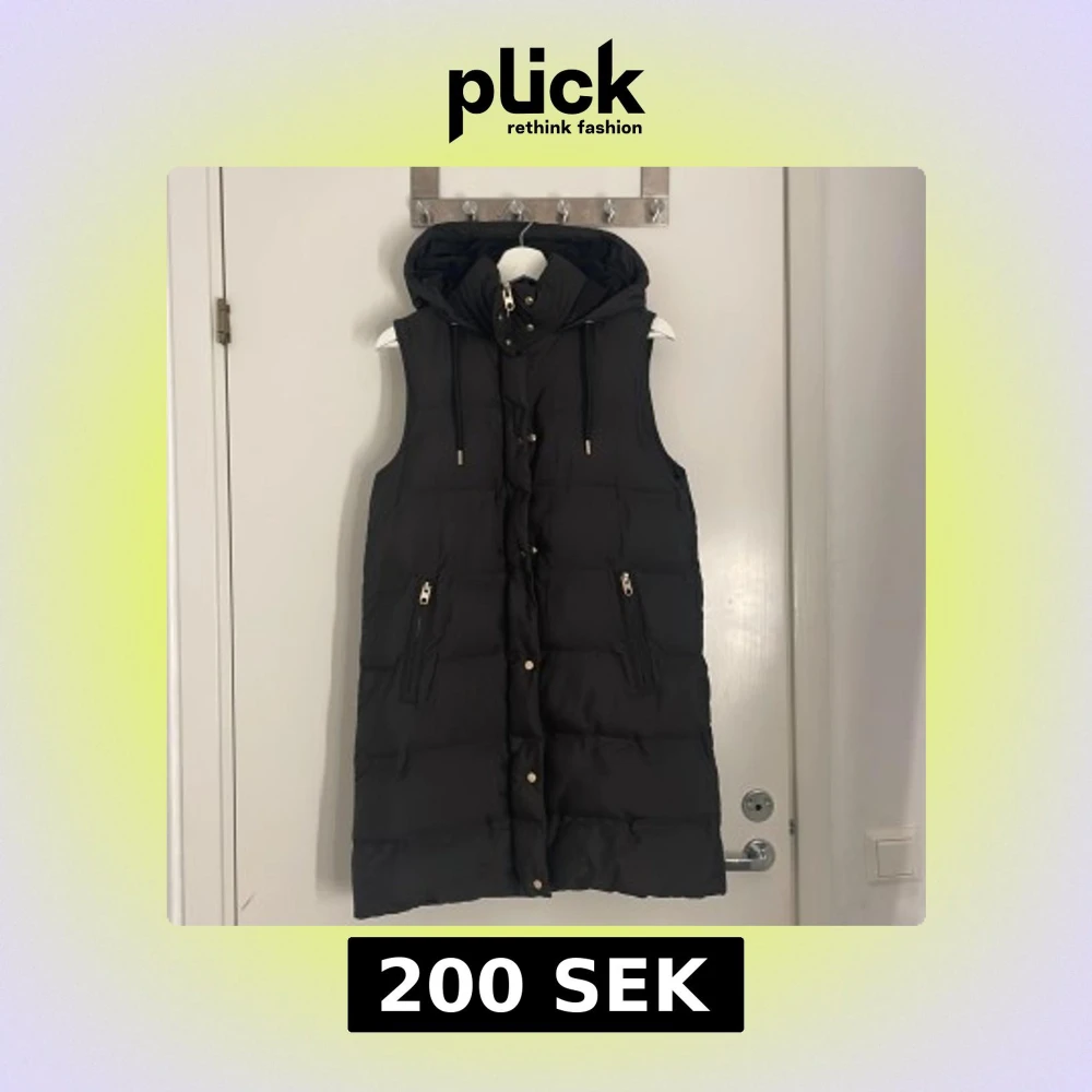 Lång svart dunväst från Zara med huva och snygga guldfärgade detaljer på dragkedjor och knappar. Västen har två fickor med dragkedja och dragsko i huvan. Perfekt för lager-på-lager och en cool streetstil.