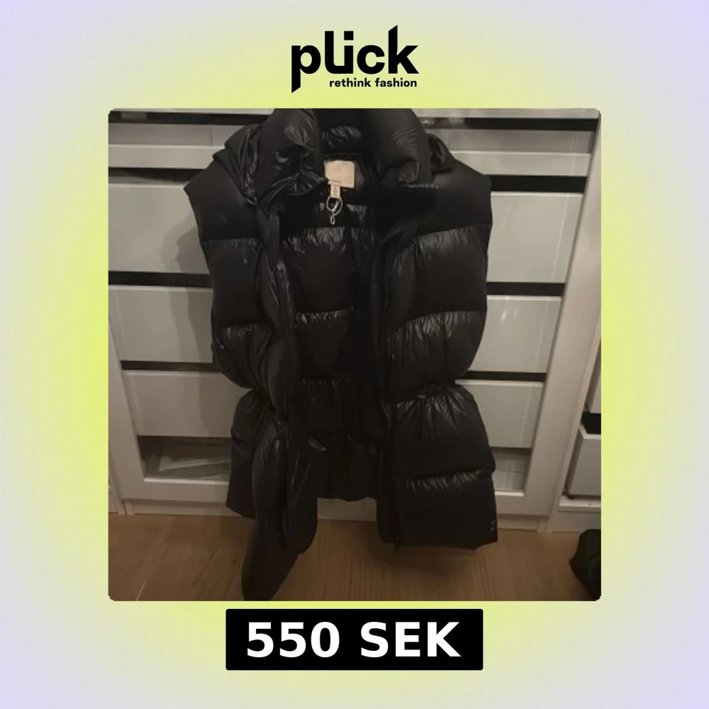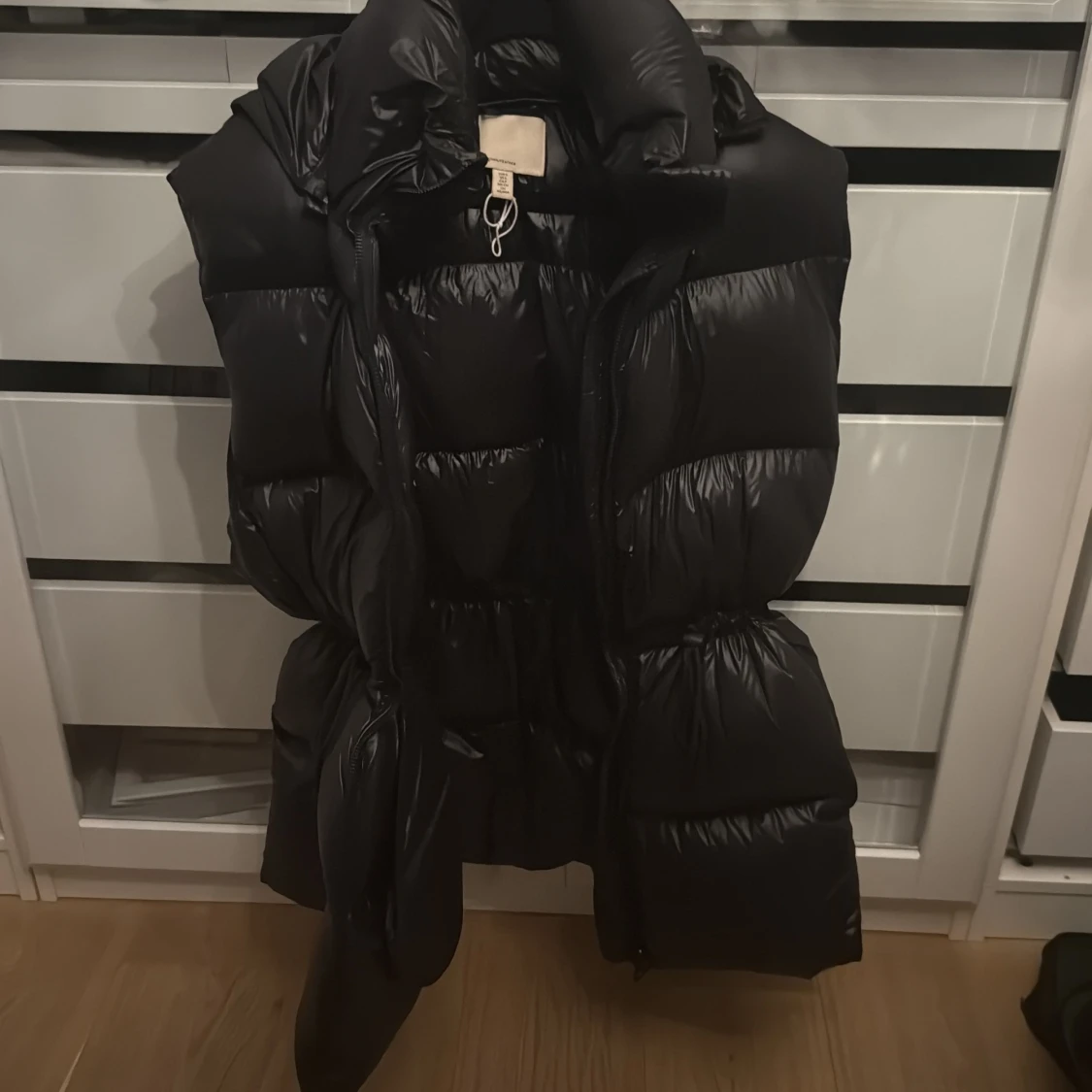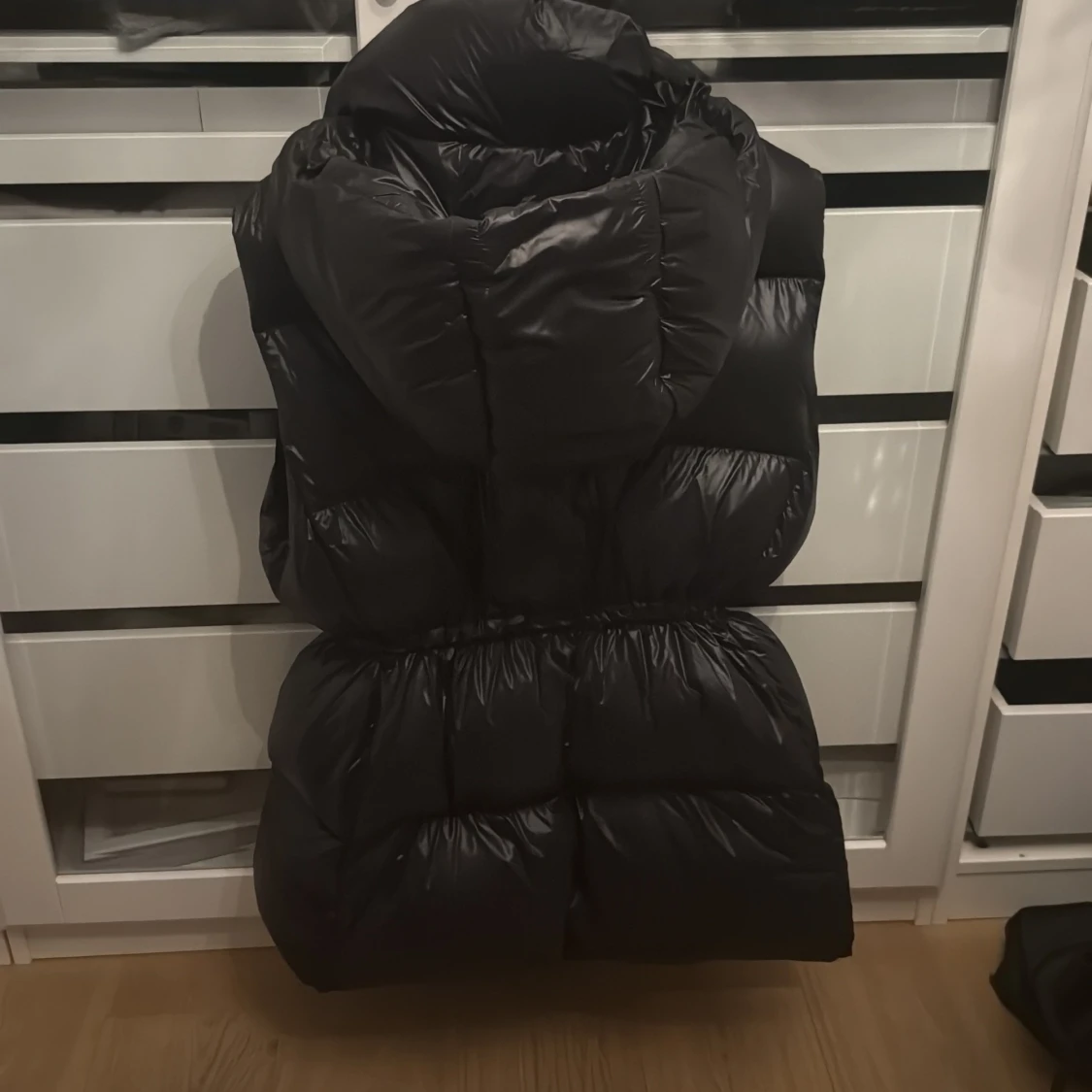 Säljer en svart lång dunväst med stor, mysig huva och markerad midja. Västen är quiltad och har en glansig finish som ger en cool look. Perfekt att slänga över en hoodie för extra värme. Stängs med dragkedja framtill.