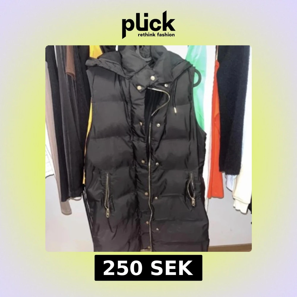 Säljer en svart lång dunväst med huva och dragkedja framtill. Västen har två fickor med dragkedjor och snygga guldfärgade detaljer. Perfekt för lager-på-lager och chillare dagar när du vill hålla värmen utan att ha jacka.