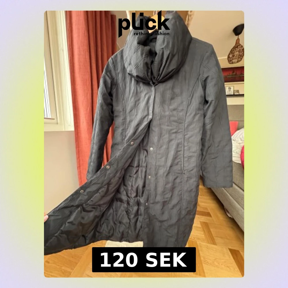 Säljer en svart lång dunjacka med quiltad struktur och stor, mysig sjalkrage. Jackan har knappar framtill och insvängda sömmar. Väldigt lätt att ta av och på! Lite tunnare design jämfört med pufferjackor.