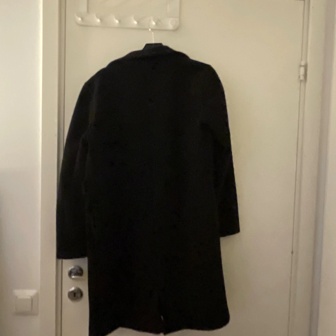 Svart lång kappa i storlek s med band runt midjan knappt använd därför den säljs.