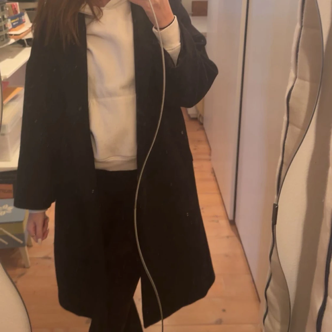 Säljer en svart, lång och stilren kappa med rak passform och breda slag. Jackan är i ullblandning och har en klassisk look som funkar till allt. Perfekt för dig som vill ha en enkel men snygg jacka till höst och vinter. (Finns en skada där bak men den syns inte när man bär kappan) NYPRIS: 1999kr