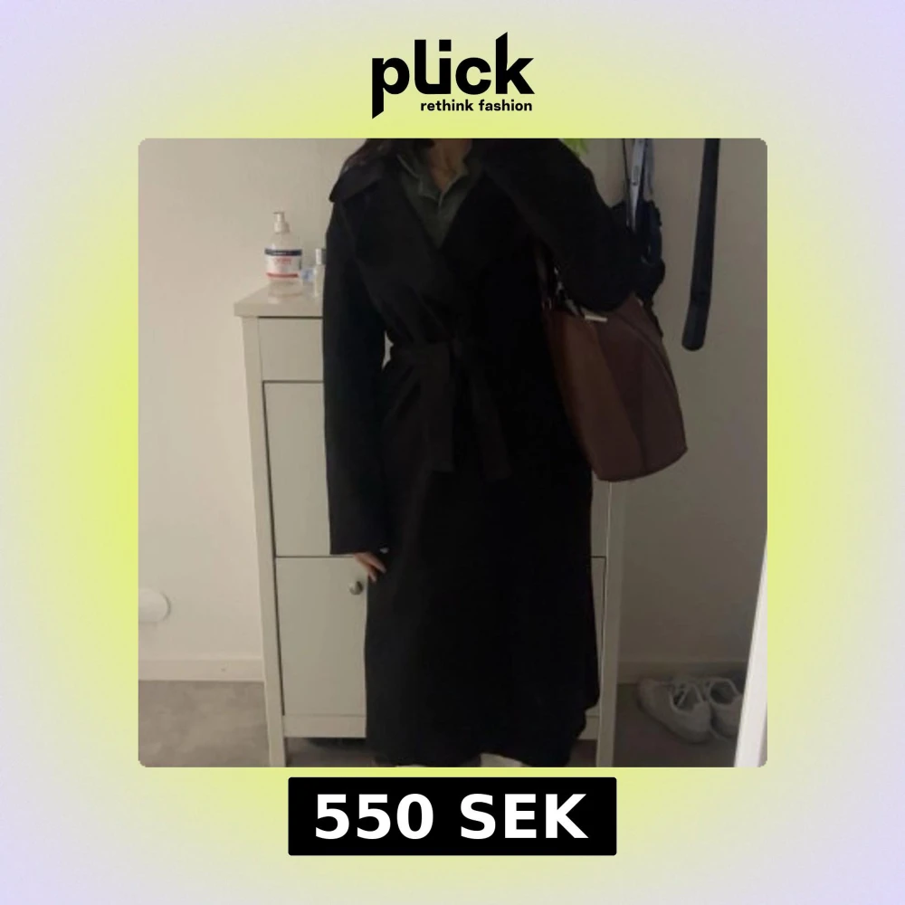Säljer en svart lång kappa med bälte i midjan och klassisk krage. Kappan har långa ärmar och en stilren, tidlös look som passar perfekt till höst och vinter. Enkel att matcha med olika outfits och ger en snygg siluett.