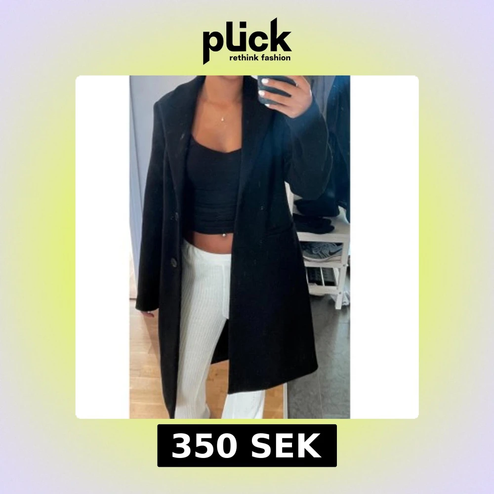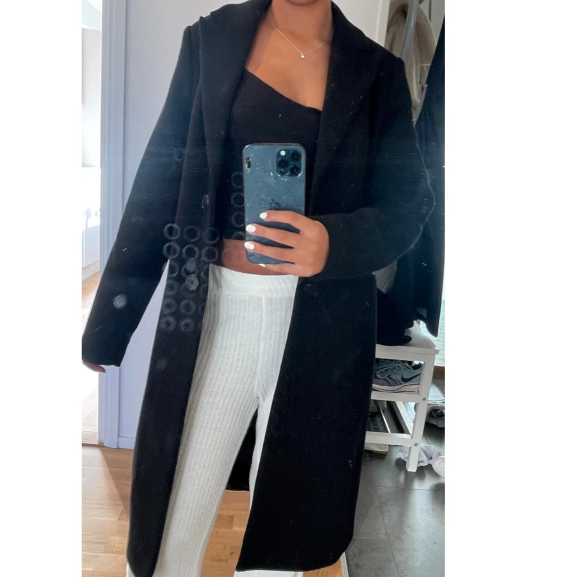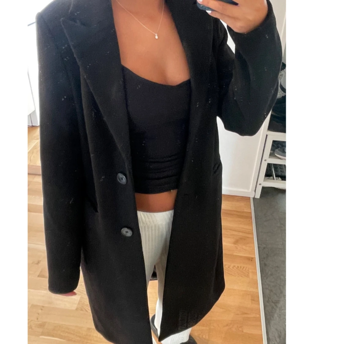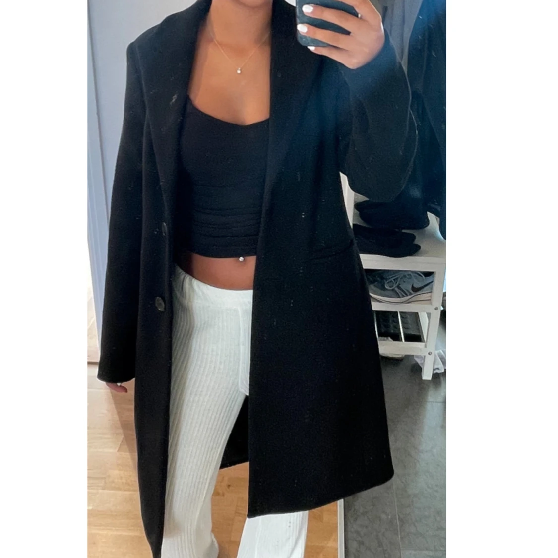 Säljer en svart, stilren kappa med klassisk krage och två stora knappar framtill. Jackan har en rak och längre passform som ger en snygg siluett. Perfekt för dig som gillar enkel och clean stil. Materialet känns mjukt och har en lite tjockare känsla.