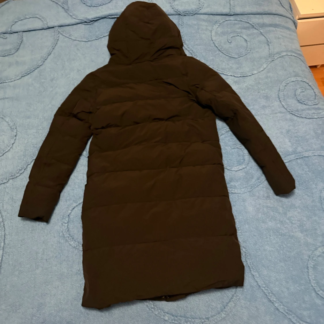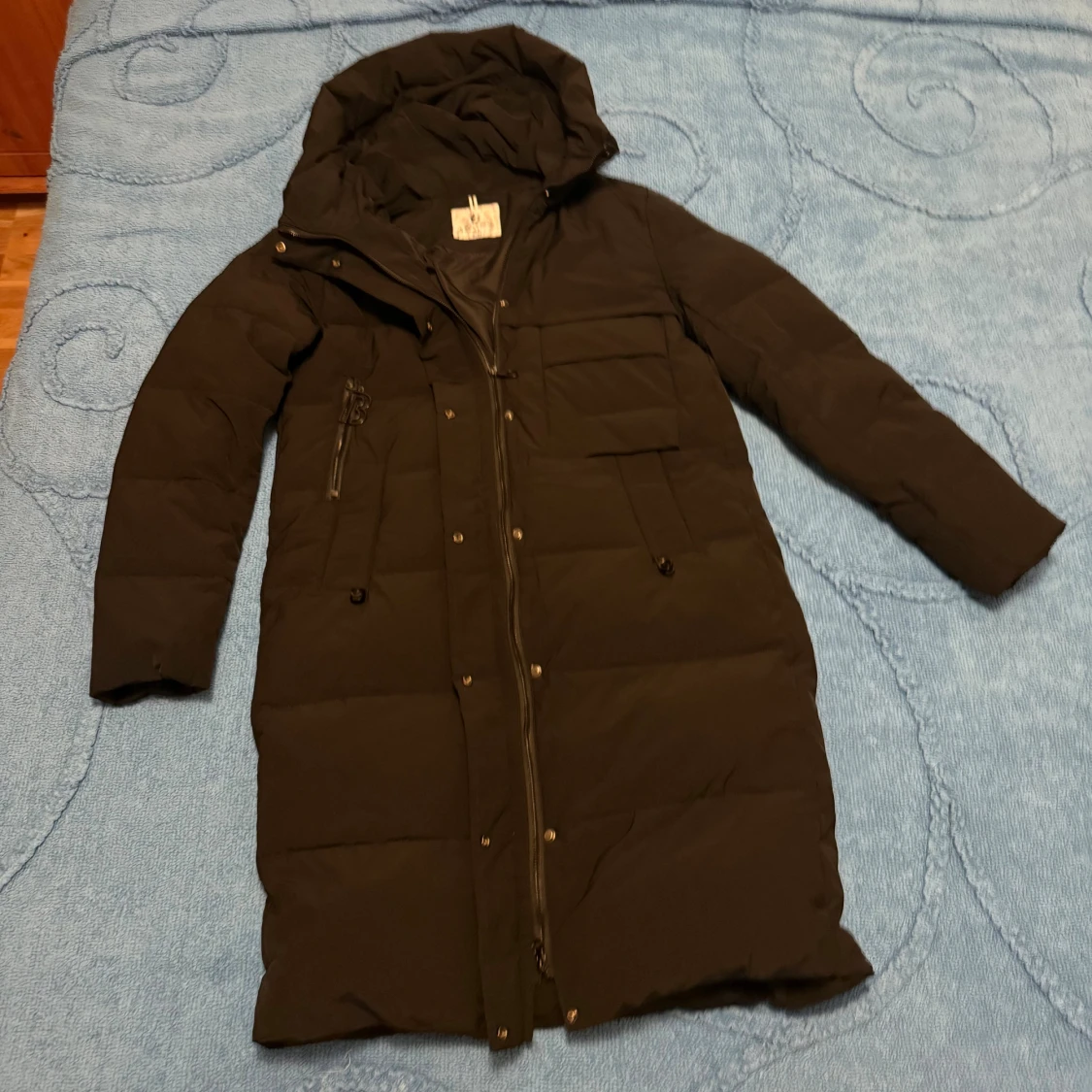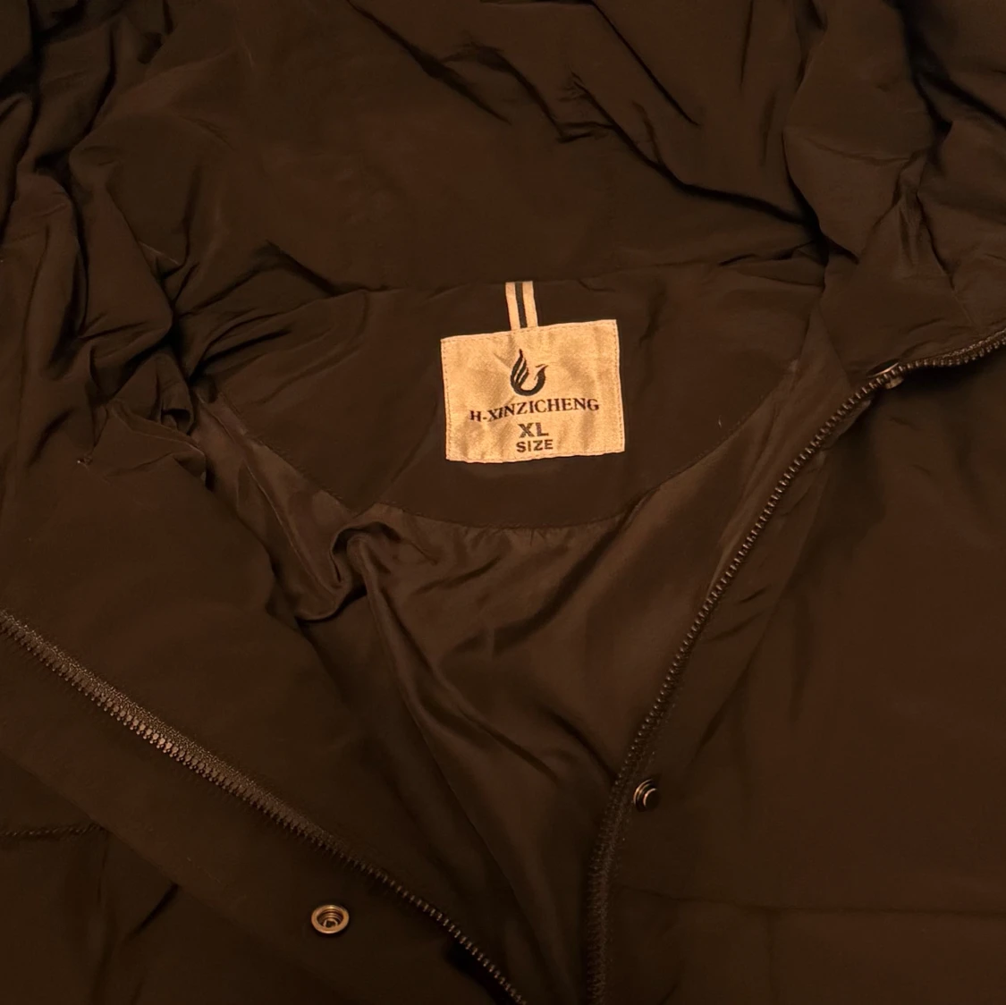 Svart lång pufferjacka från H-XINZICHENG i storlek XL. Jackan har huva med snörning, flera fickor med dragkedja och knappar framtill. Perfekt för kalla dagar med sin quiltade design och långa ärmar. Snygg och enkel stil som funkar till det mesta.