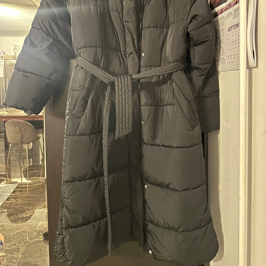 Lång svart pufferjacka från BikBok med quiltad design och bälte i midjan. Jackan har hög krage, dragkedja och tryckknappar framtill samt långa ärmar. Perfekt för kalla dagar när du vill hålla dig varm och snygg. Jackan har även slits där nere.