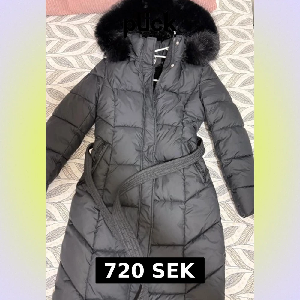 Snygg svart pufferjacka med lång passform och huva med fluffig fuskpäls. Jackan har quiltad design, dragkedja och knappar framtill samt ett bälte i midjan för extra stilpoäng. Insidan är fodrad med mjuk pälsimitation som gör den extra varm under kalla dagar. Luvan går även att ta bort samt pälsen på luvan och pälsen på luvan är inte äkta ☺️