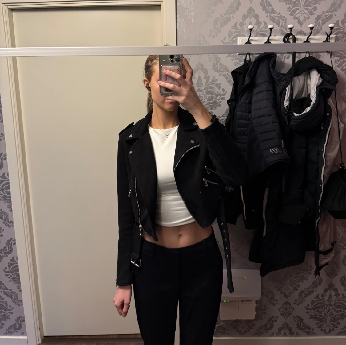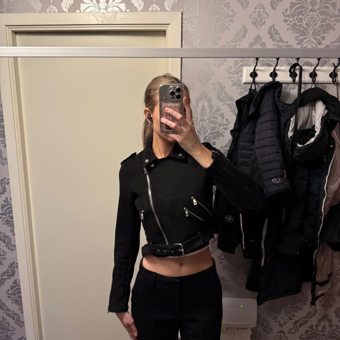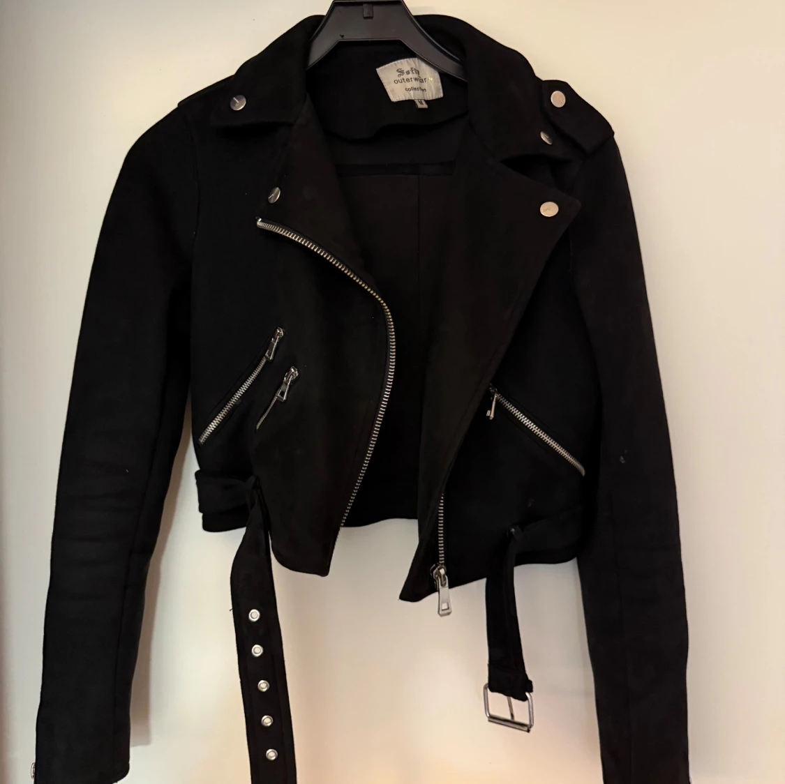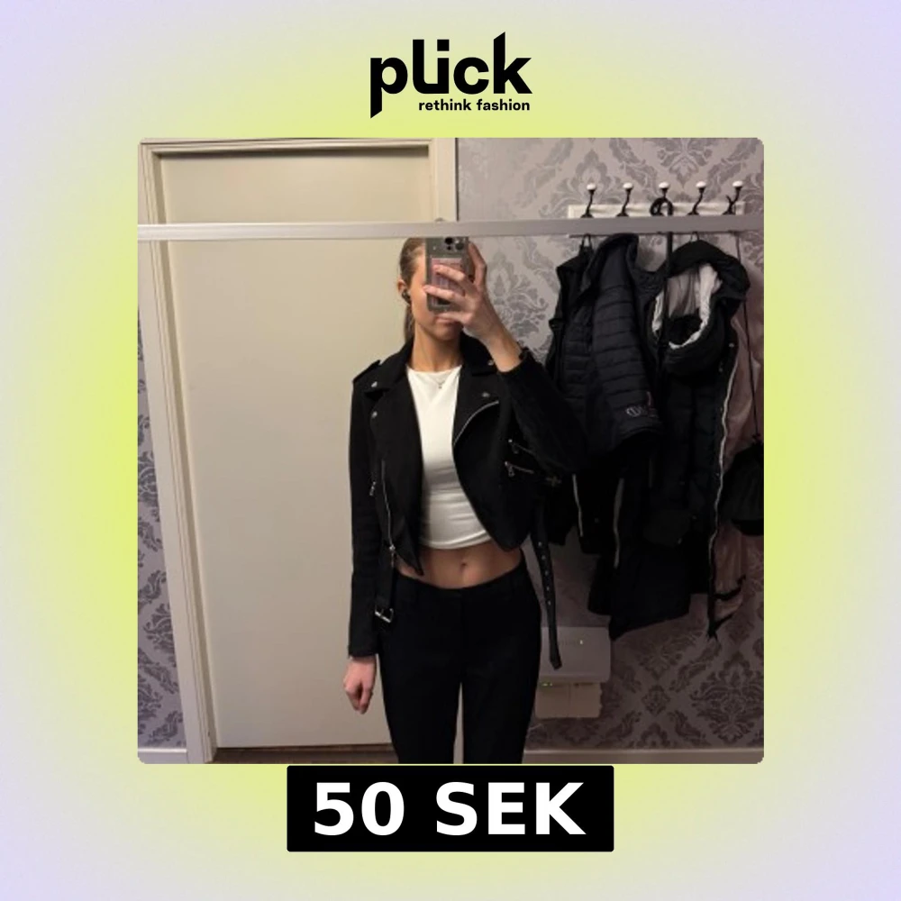 Fin svart lite kortare mocka jacka. Allt är helt, ganska använd men har legat på hyllan nått år. Den är i storlek M men skulle nog säga att den är mer som än S