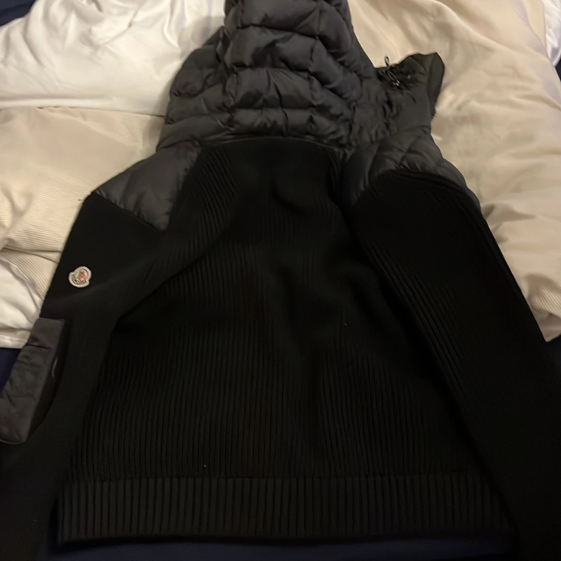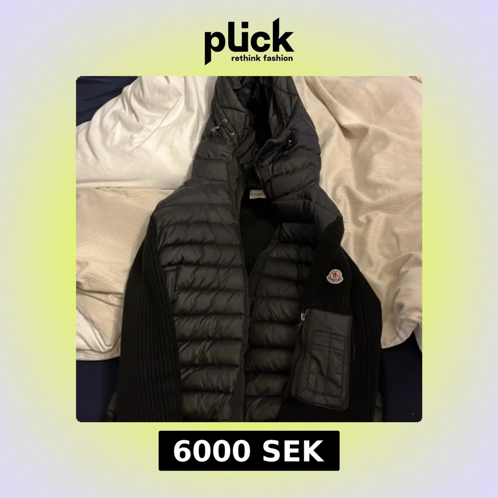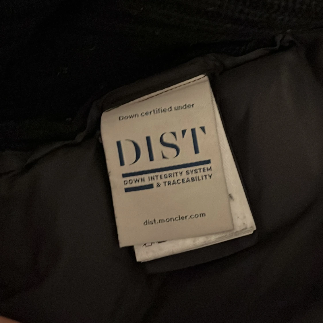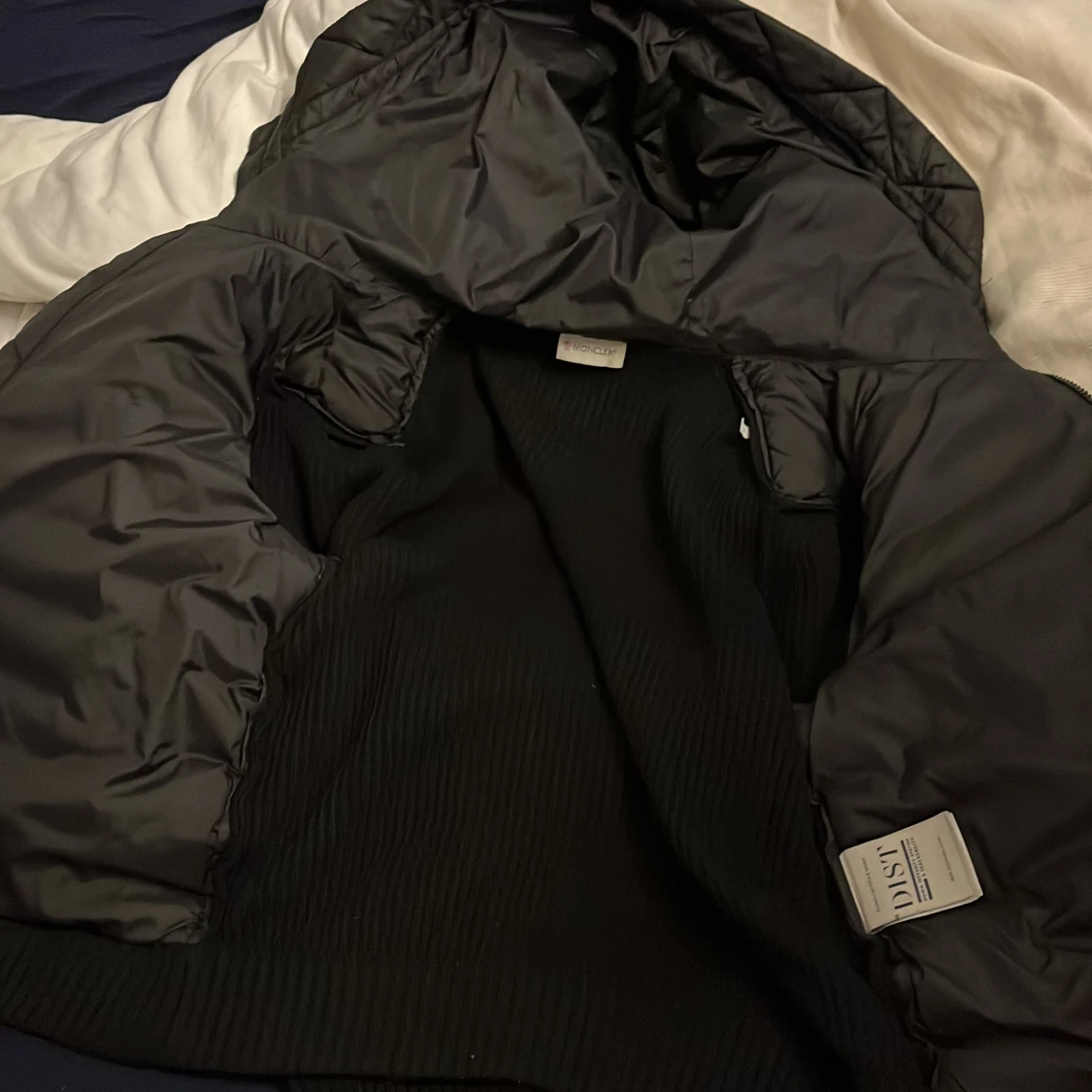 Säljer en snygg svart dunjacka från Moncler med quiltad design och dragkedja. Jackan har en hög krage och en liten logotyp på ärmen. Perfekt för kyliga dagar!