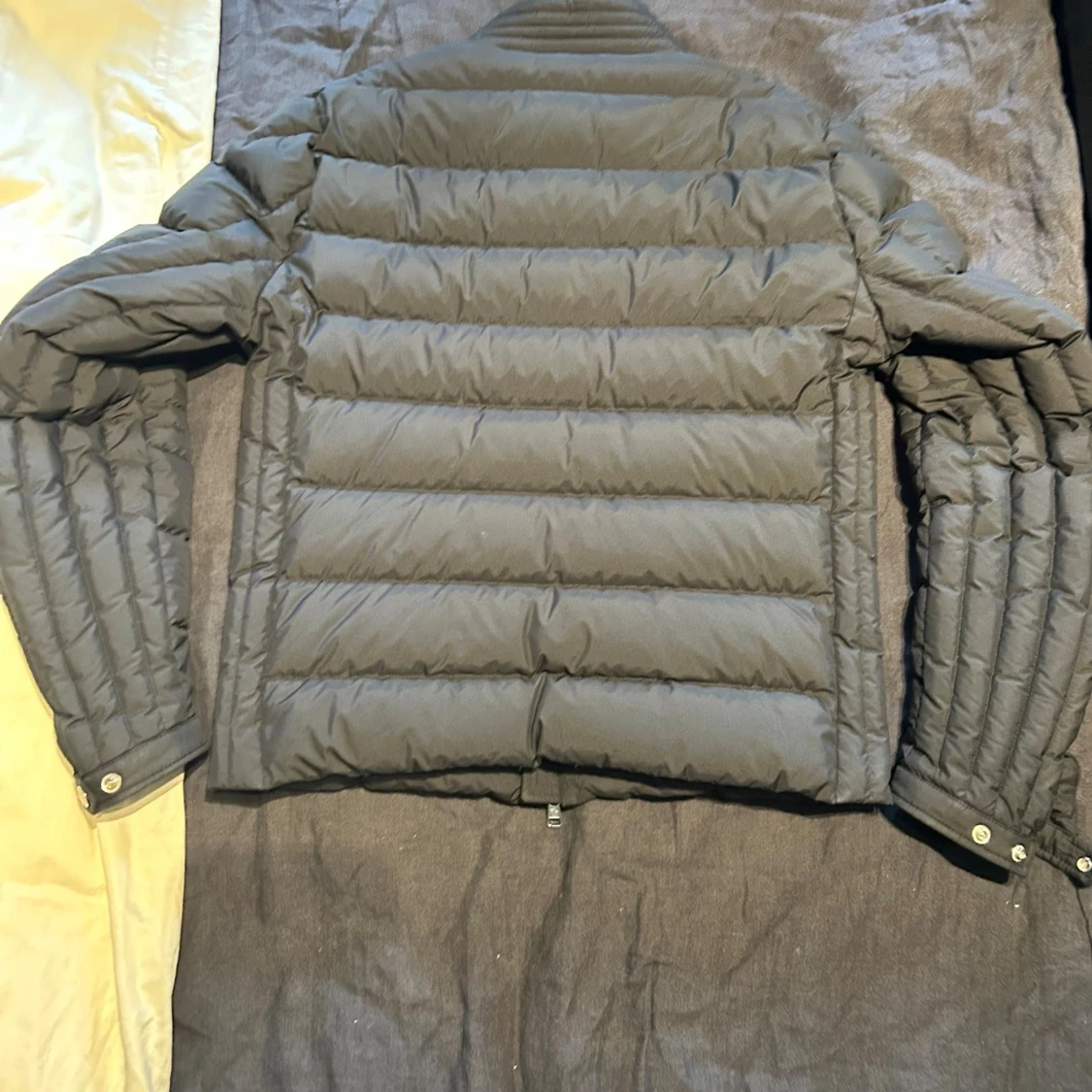 Använd fåtal gånger. Köpt på nk.Säljer en svart pufferjacka från Moncler med klassisk quiltad design och ståkrage. Jackan har tre dragkedjefickor framtill, snygga detaljer vid ärmslut och ikonisk Moncler-logga på ärmen. Perfekt för kalla dagar och riktigt stilren look.