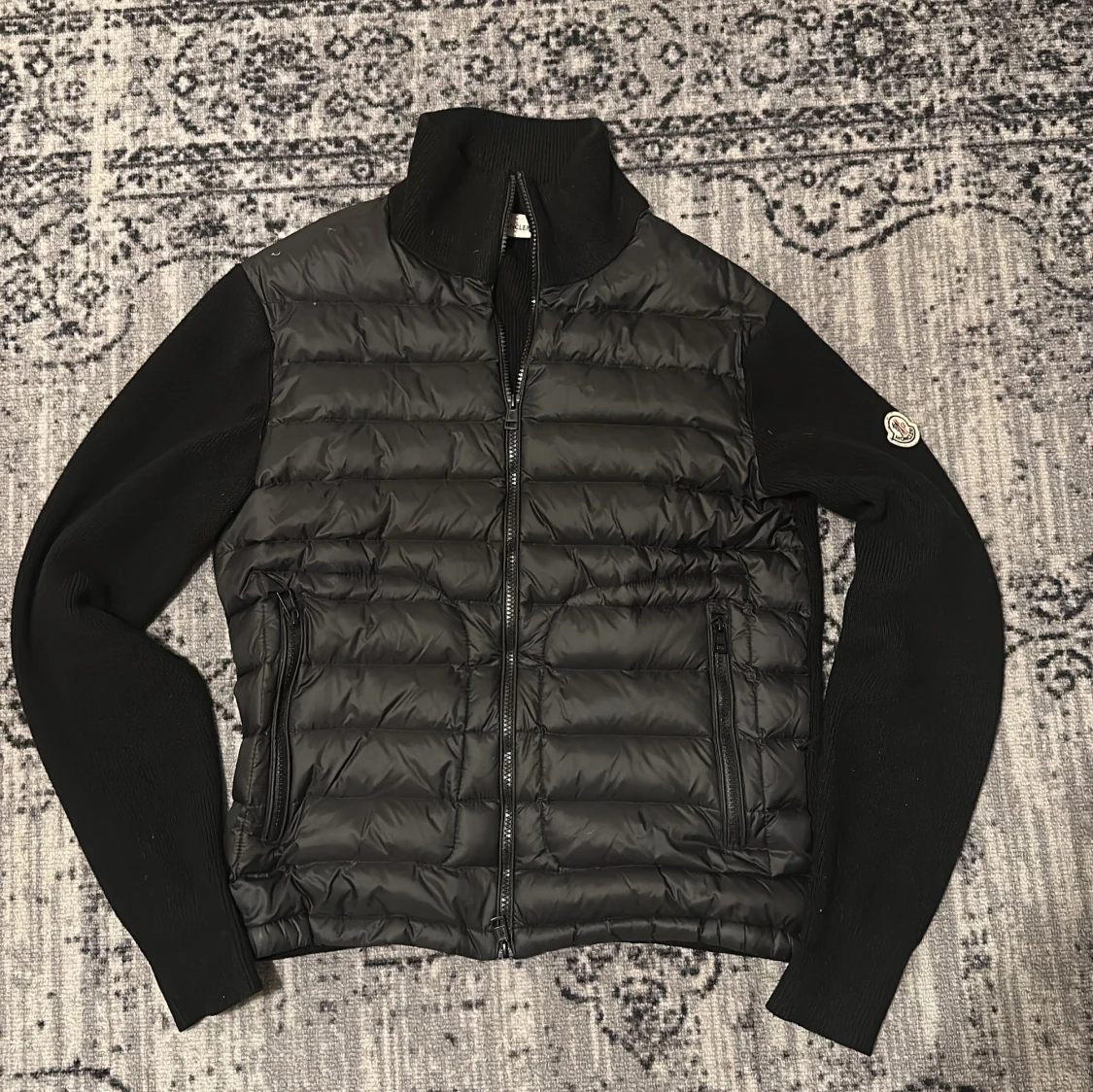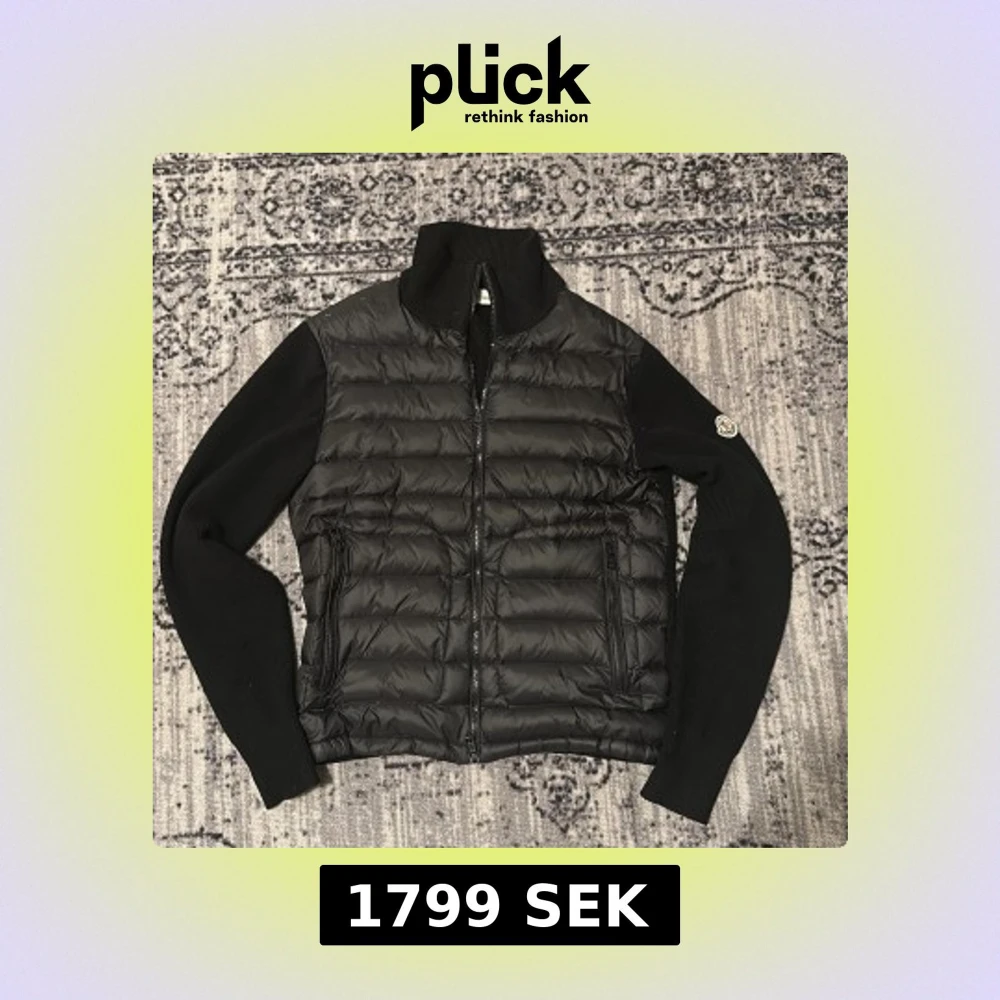 Svart Moncler cardigan med stickade ärmar och quiltad front. Dragkedja framtill och två dragkedjeförsedda fickor. Klassisk Moncler-logga på ena ärmen. Perfekt för höst och vinter när du vill hålla stilen. Och man kan även skanna loggan på sidan. Priset är ej hugget i sten så var inte rädda att ställa frågor 😁