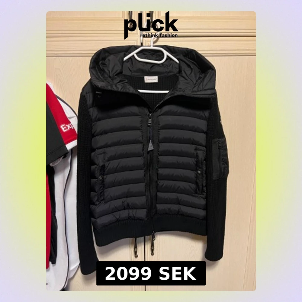Svart cardigan från Moncler med stickade ärmar och rygg, quiltad framsida och huva. Jackan har dragkedja framtill, fickor med dragkedja och Moncler-logga på ärmen. Snygg och sportig look med ribbade muddar och justerbar nederkant. Använd 4-5 gånger, mycket bra skick. Inga fel eller fläckar.