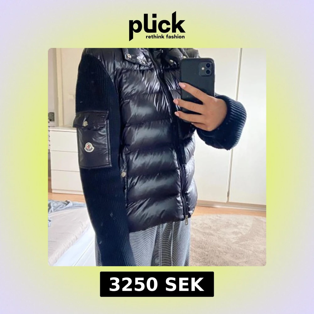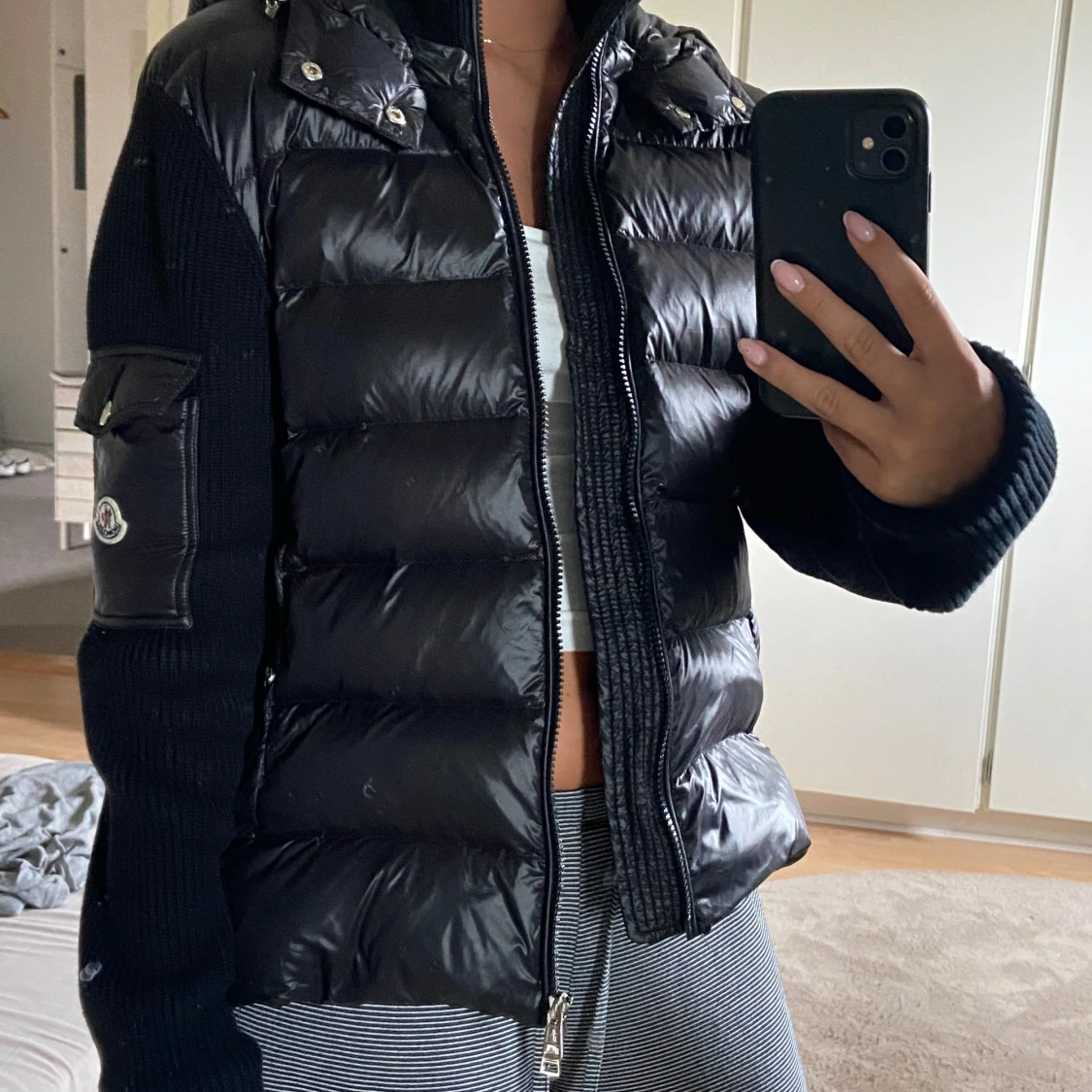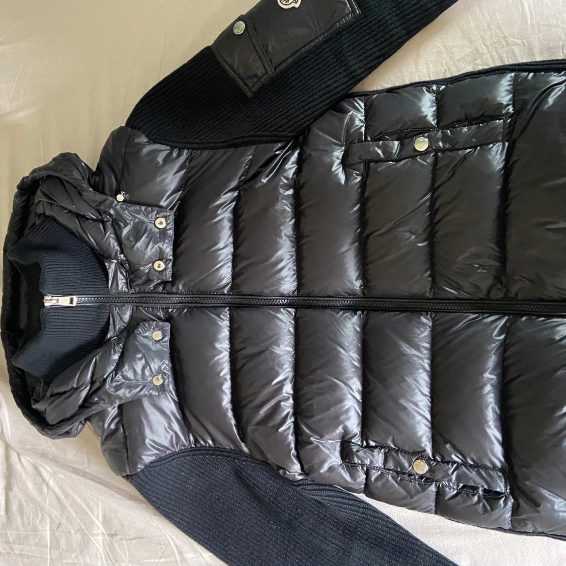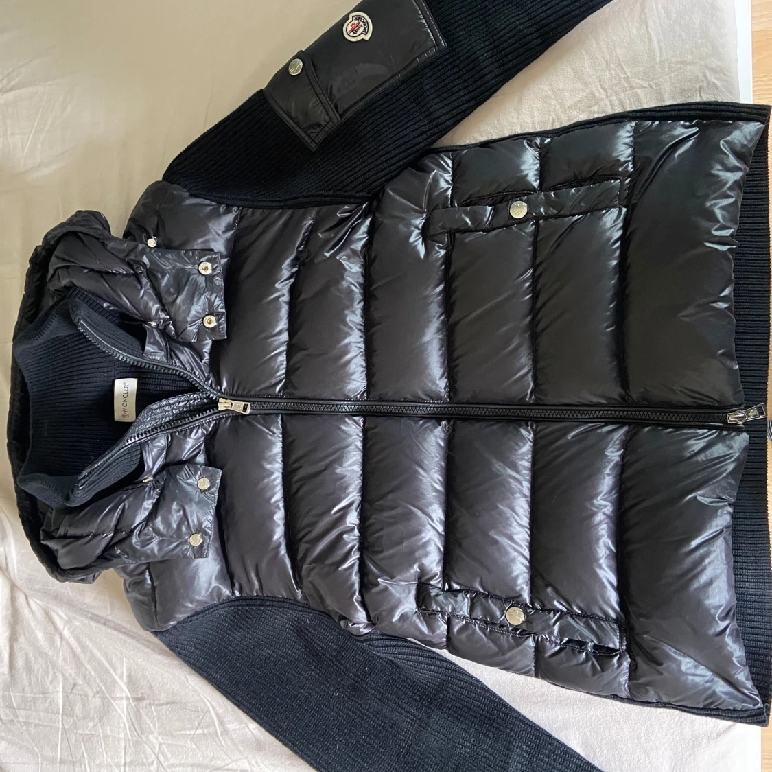 Säljer en svart Cardigan från Moncler med glansig dunfront och stickade ärmar. Jackan har dragkedja, hög krage, fickor med tryckknappar och Moncler-logga på ärmen. Perfekt för dig som vill ha en snygg och varm jacka.