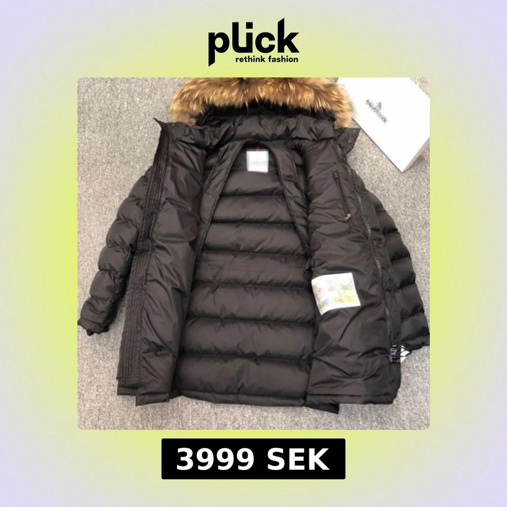 Svart dunjacka från Moncler med fluffig pälskrage i bruna toner. Jackan har quiltad design, dragkedja och knappar framtill samt flera fickor. Perfekt för kalla dagar och har en klassisk Moncler-logga på ärmen. Storlek 3 vilket motsvarar L
