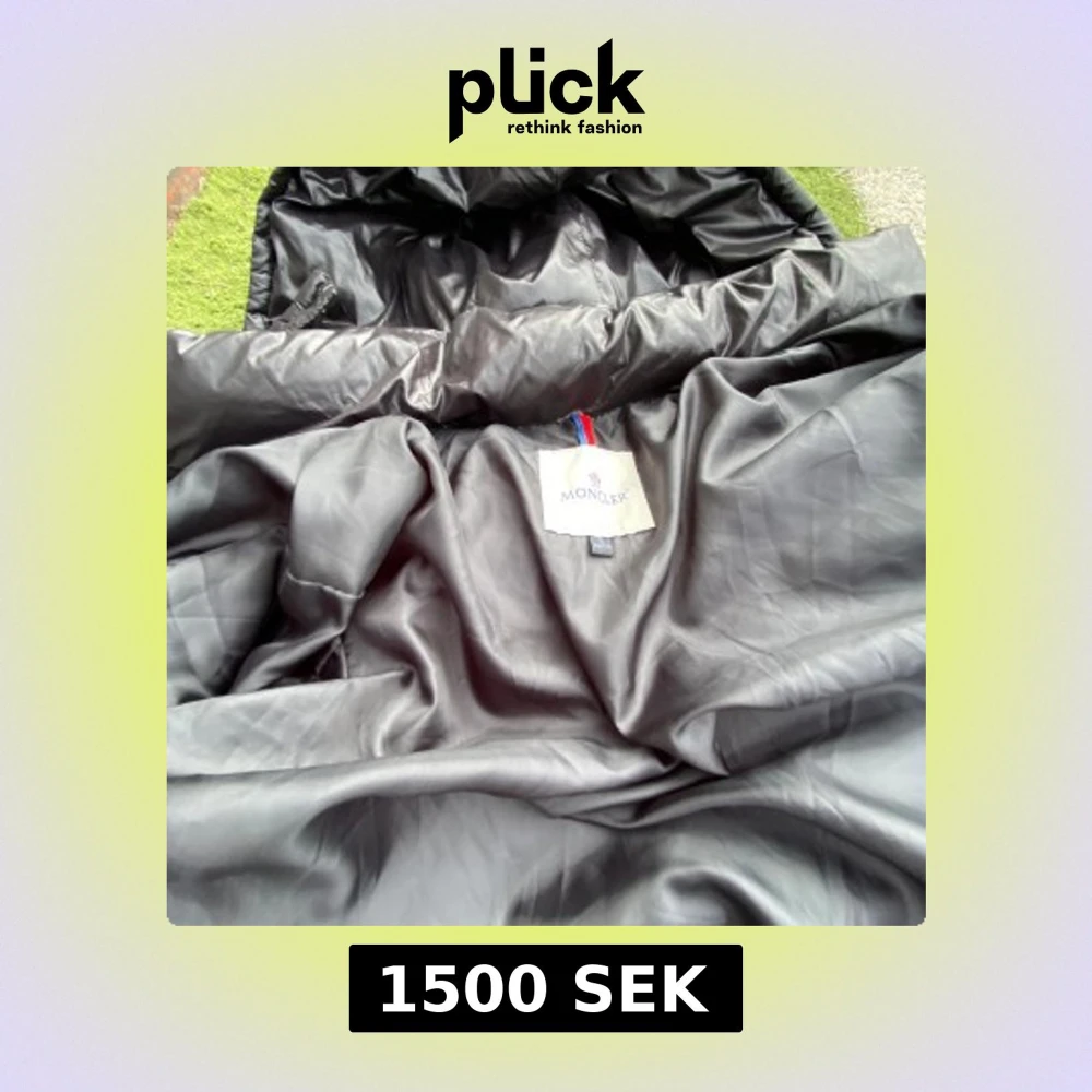 Säljer en svart dunjacka från Moncler med klassisk logga på ärmen och coolt serietidningsfoder på insidan. Jackan är vadderad och har en glansig finish som ger en lyxig vibe. Perfekt för kalla dagar när du vill hålla stilen.