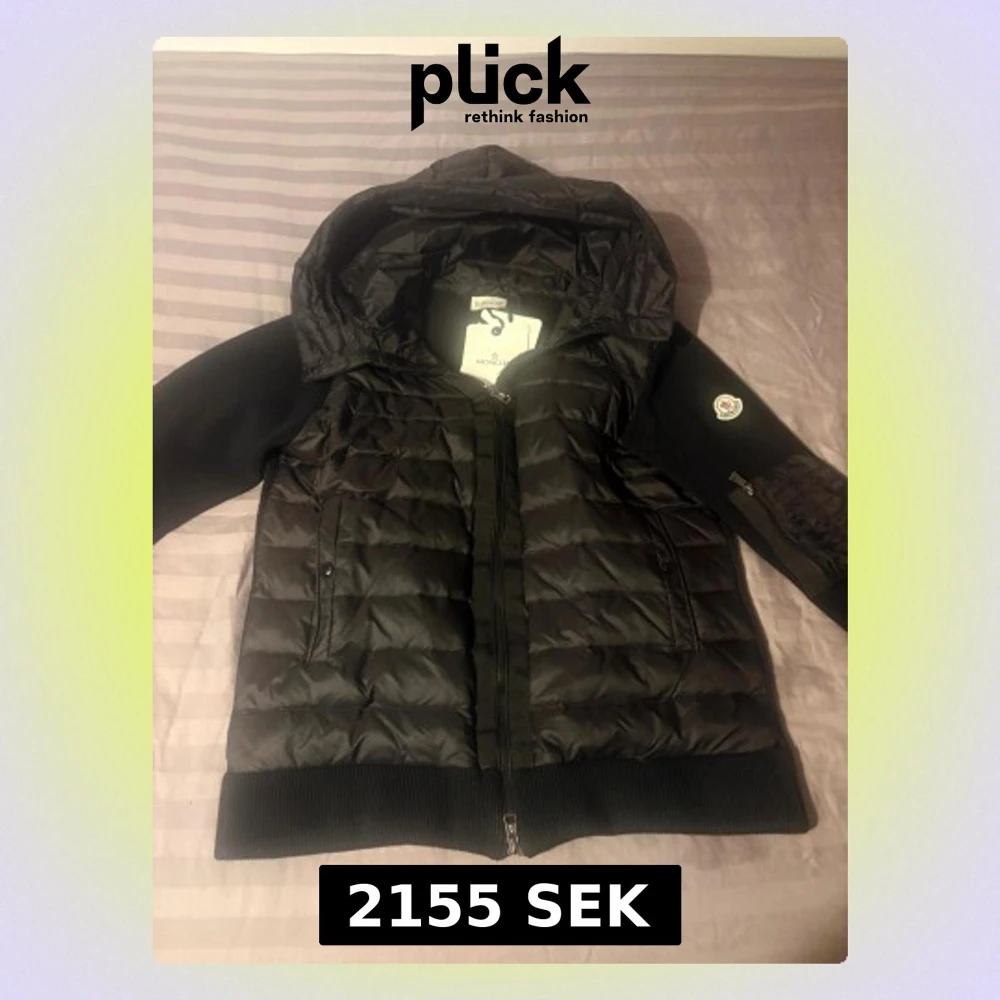 Svart dunjacka från Moncler med quiltad front, stickade ärmar och ribbade muddar. Jackan har huva, dragkedja framtill och Moncler-logga på ärmen. Perfekt för kyliga dagar och riktigt snygg streetstil.