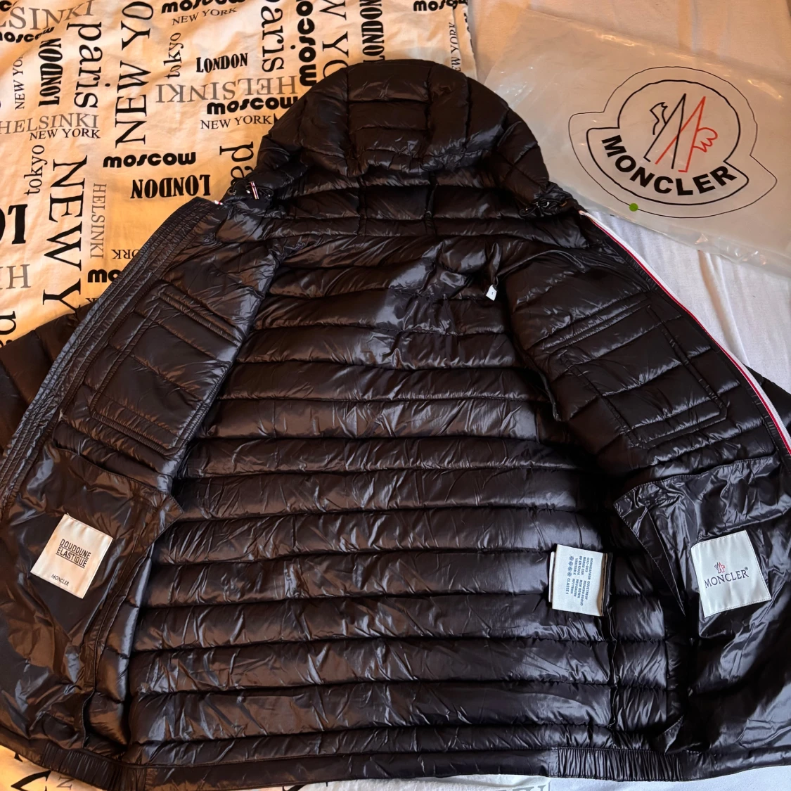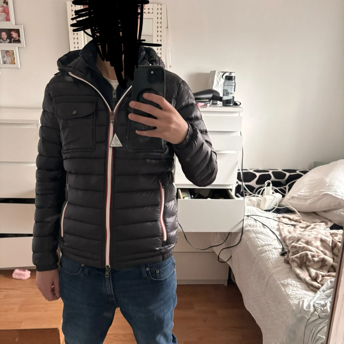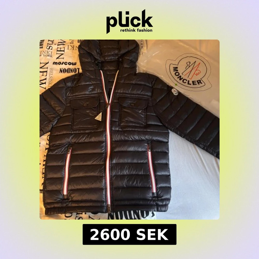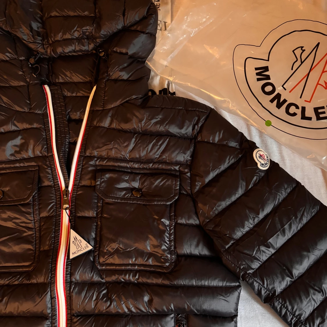 Svart dunjacka från Moncler, huva och två stora bröstfickor med lock. Jackan har röda och vita detaljer på dragkedjorna och klassisk Moncler-logga på ärmen. Perfekt för kalla dagar och riktigt snygg streetstil. Det är storlek 1 motsvarar S och passar någon som är ca 177cm lång och väger 65kg. Finns ingen i Sverige som säljer detta skicket på jackan för ett så billigt pris. INGA HÅL ELLER SKADOR.