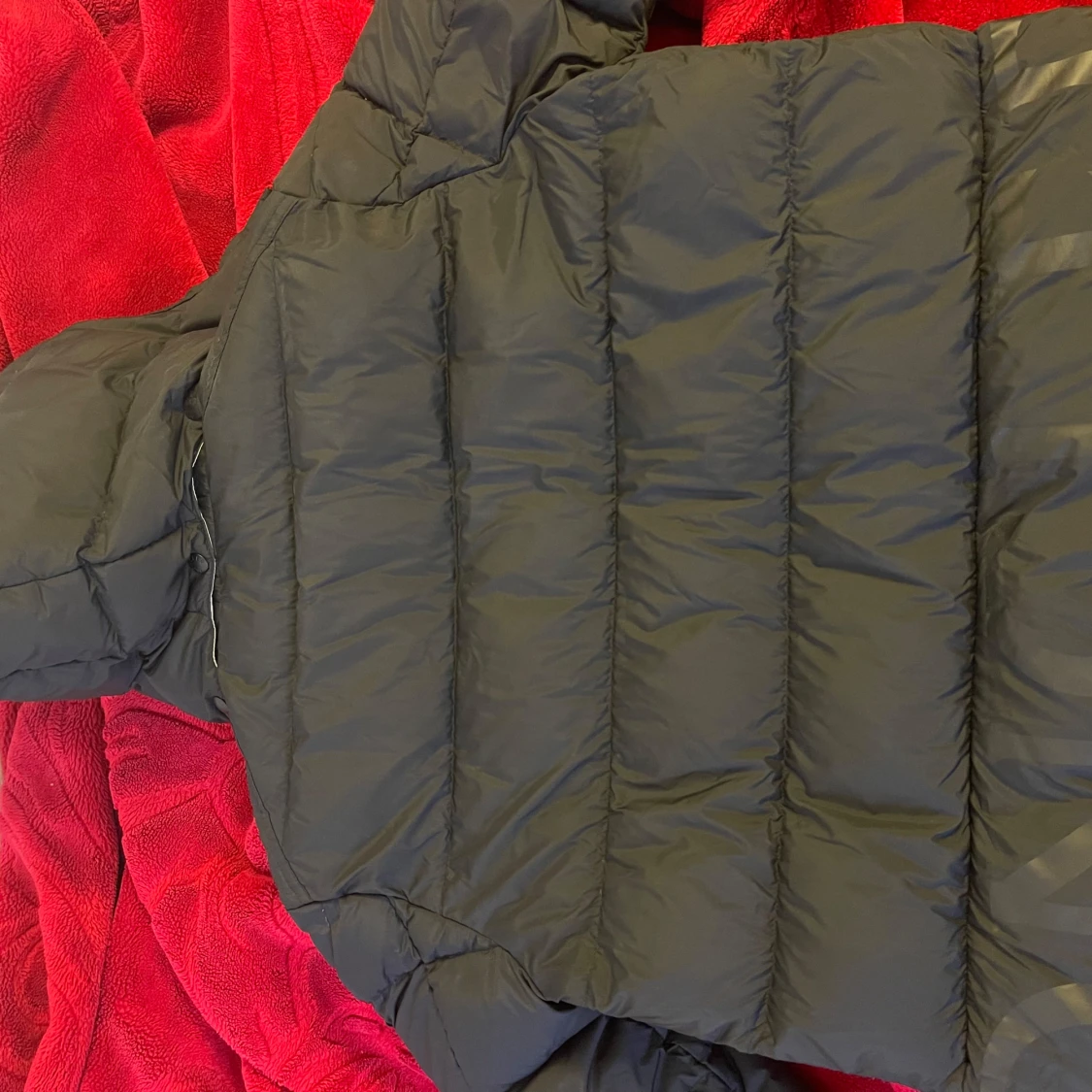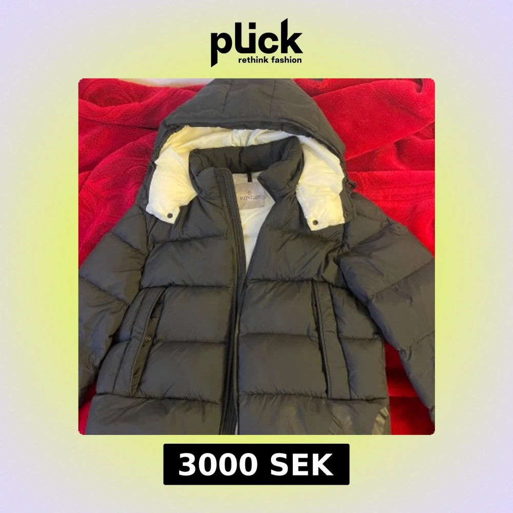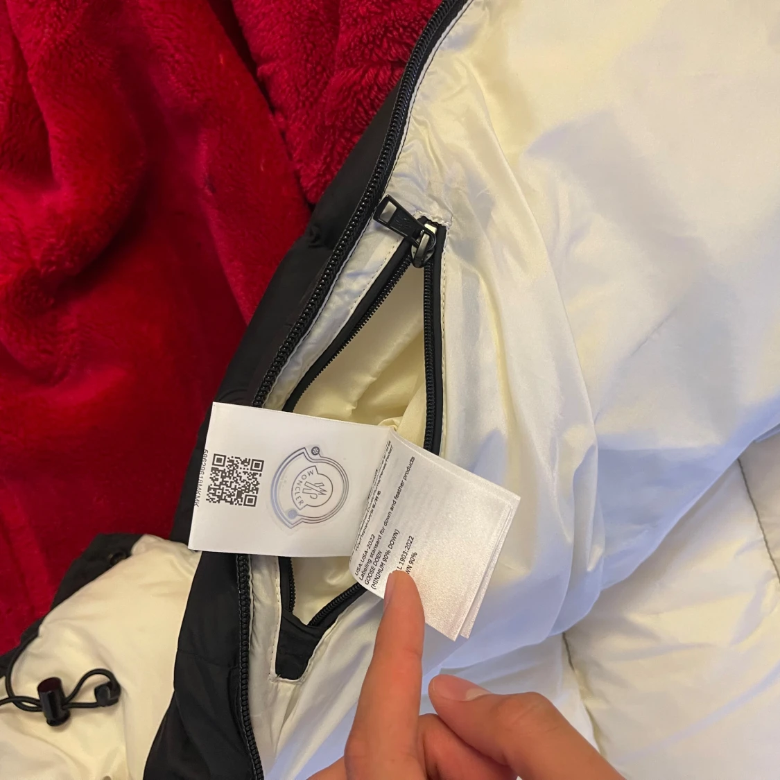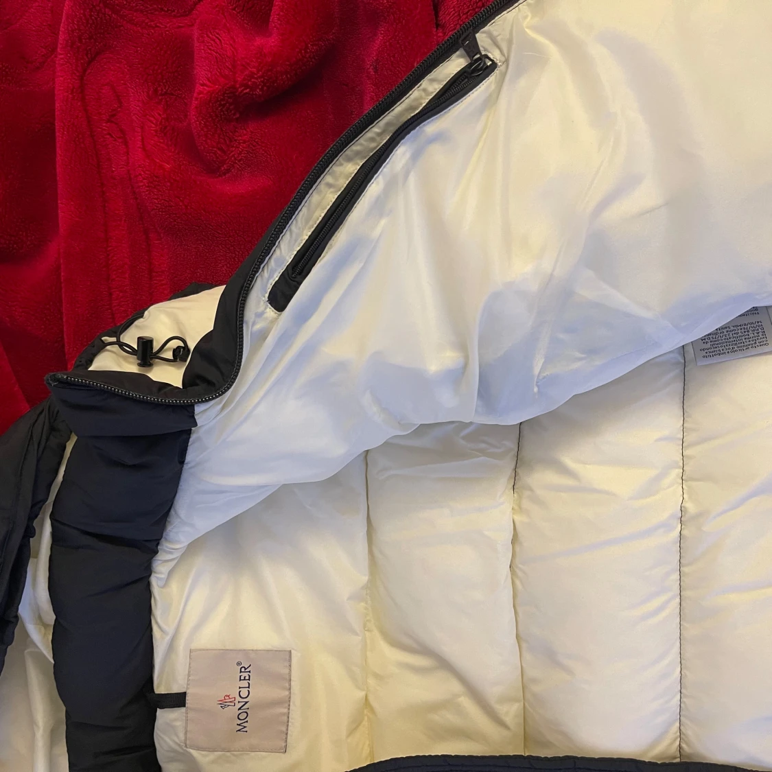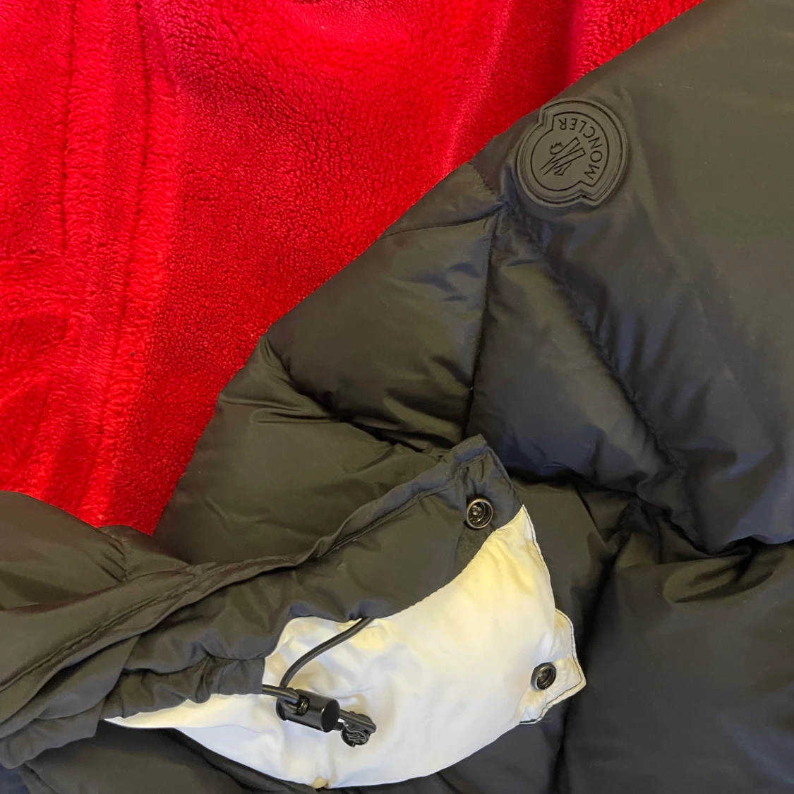 Snygg svart dunjacka från Moncler med vit insida och stor huva. Jackan har dragkedja, praktiska fickor och Moncler-logga på ärmen. Perfekt för kalla dagar när du vill hålla stilen och värmen. Klassisk pufferlook och riktigt skön passform.