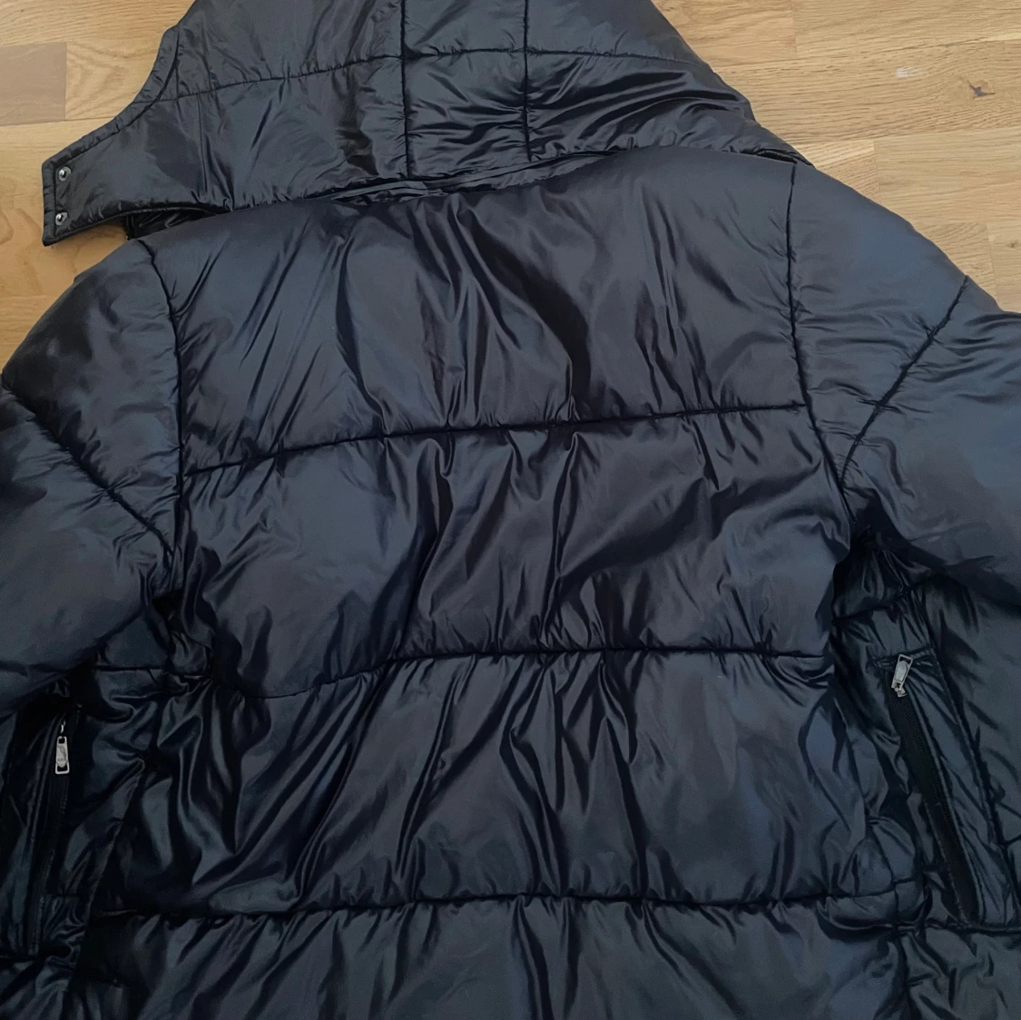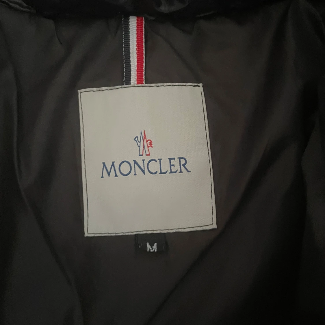 Säljer en svart dunjacka från Moncler med glansig finish, huva och dragkedja framtill. Jackan har två sidofickor med dragkedja och en bröstficka med Moncler-logga. Perfekt för kalla dagar och riktigt snygg streetstil.