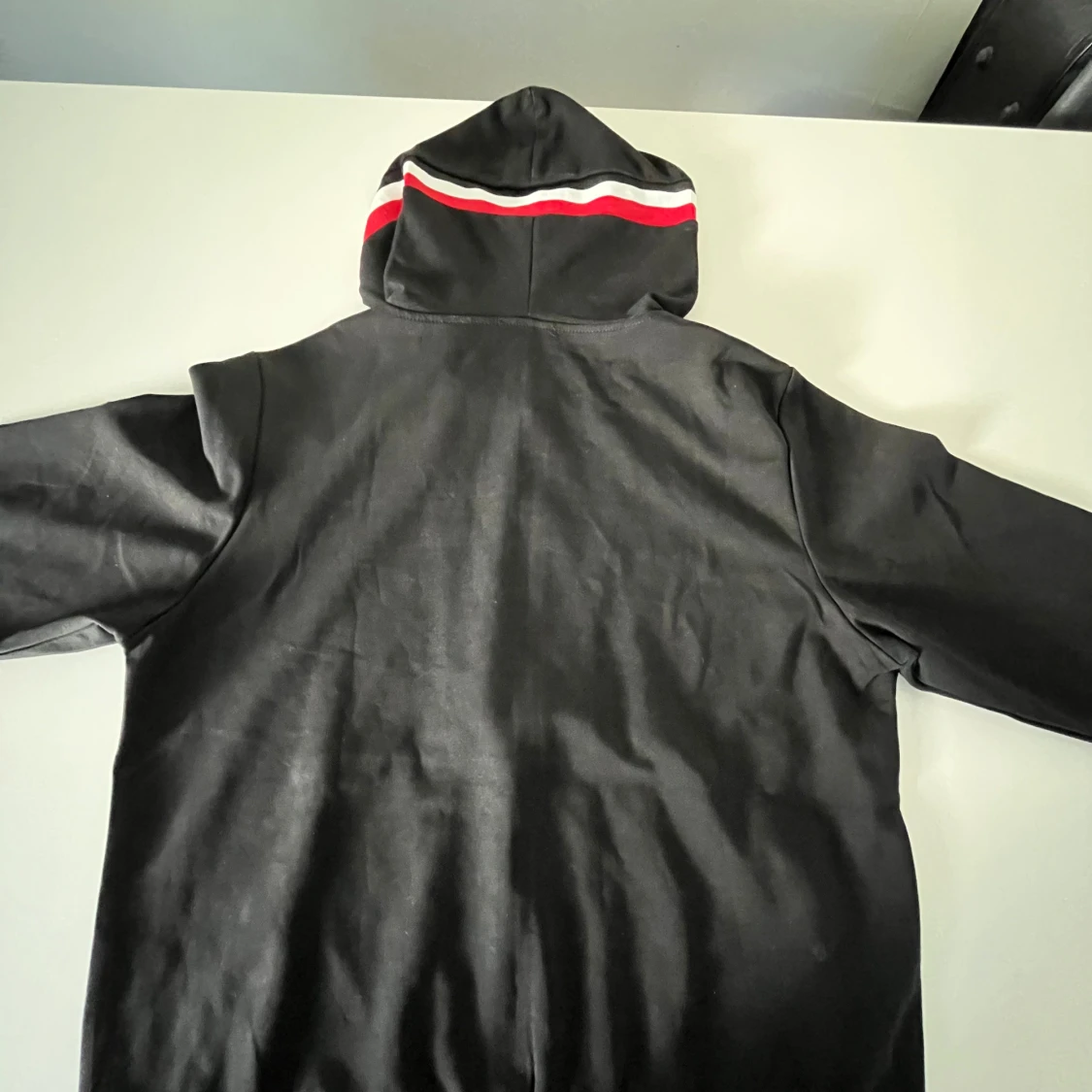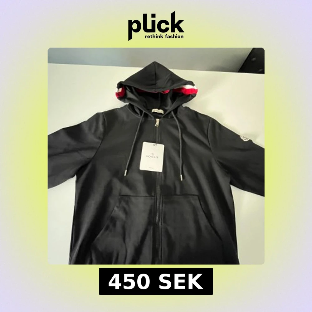 Svart hoodiejacka från Moncler med hel dragkedja, huva med röd och vit rand samt logotyp på ärmen. Jackan har känguruficka framtill och snörning i huvan. Perfekt för dig som gillar stilren och sportig look.