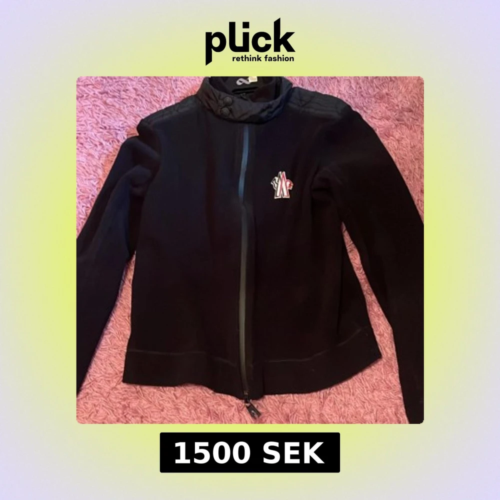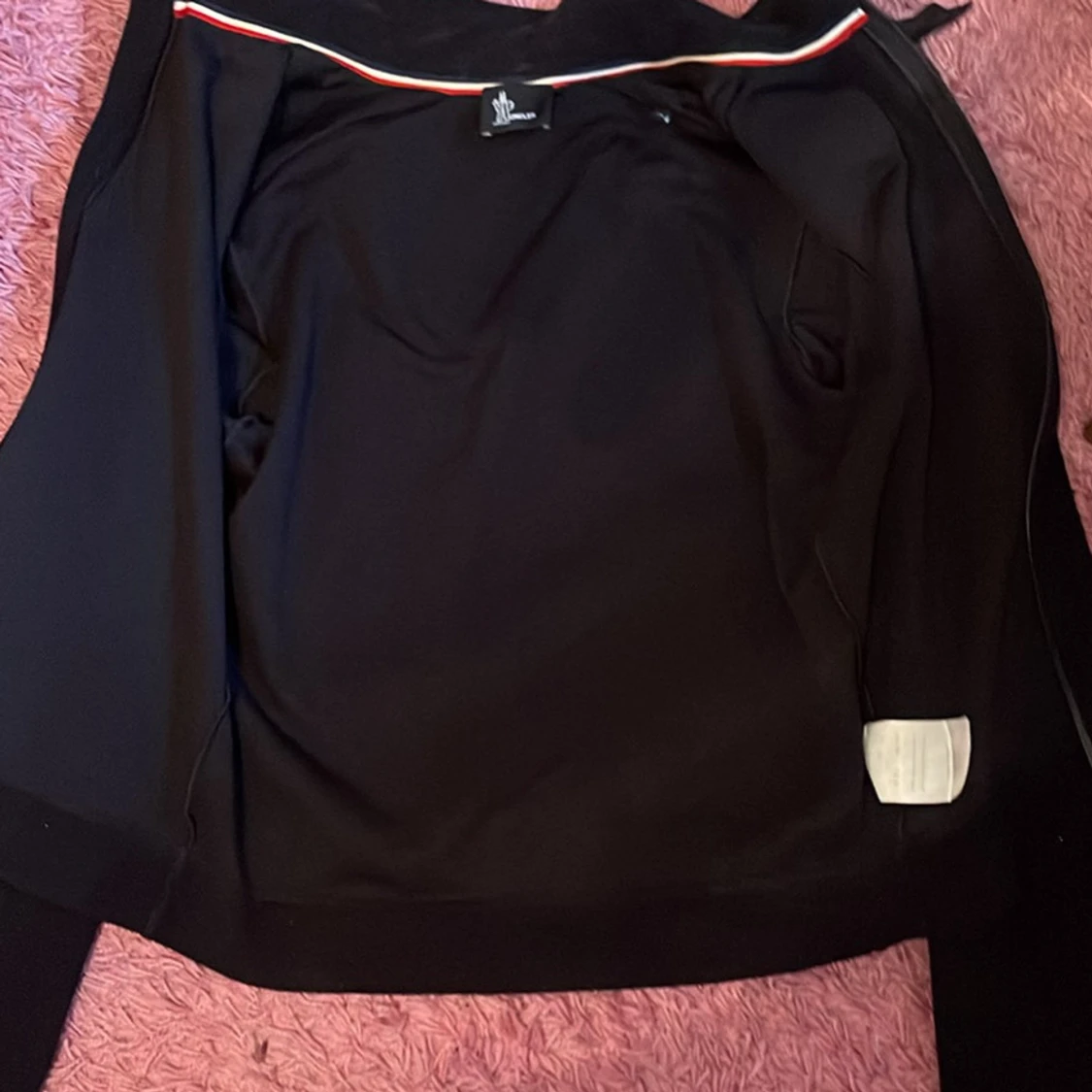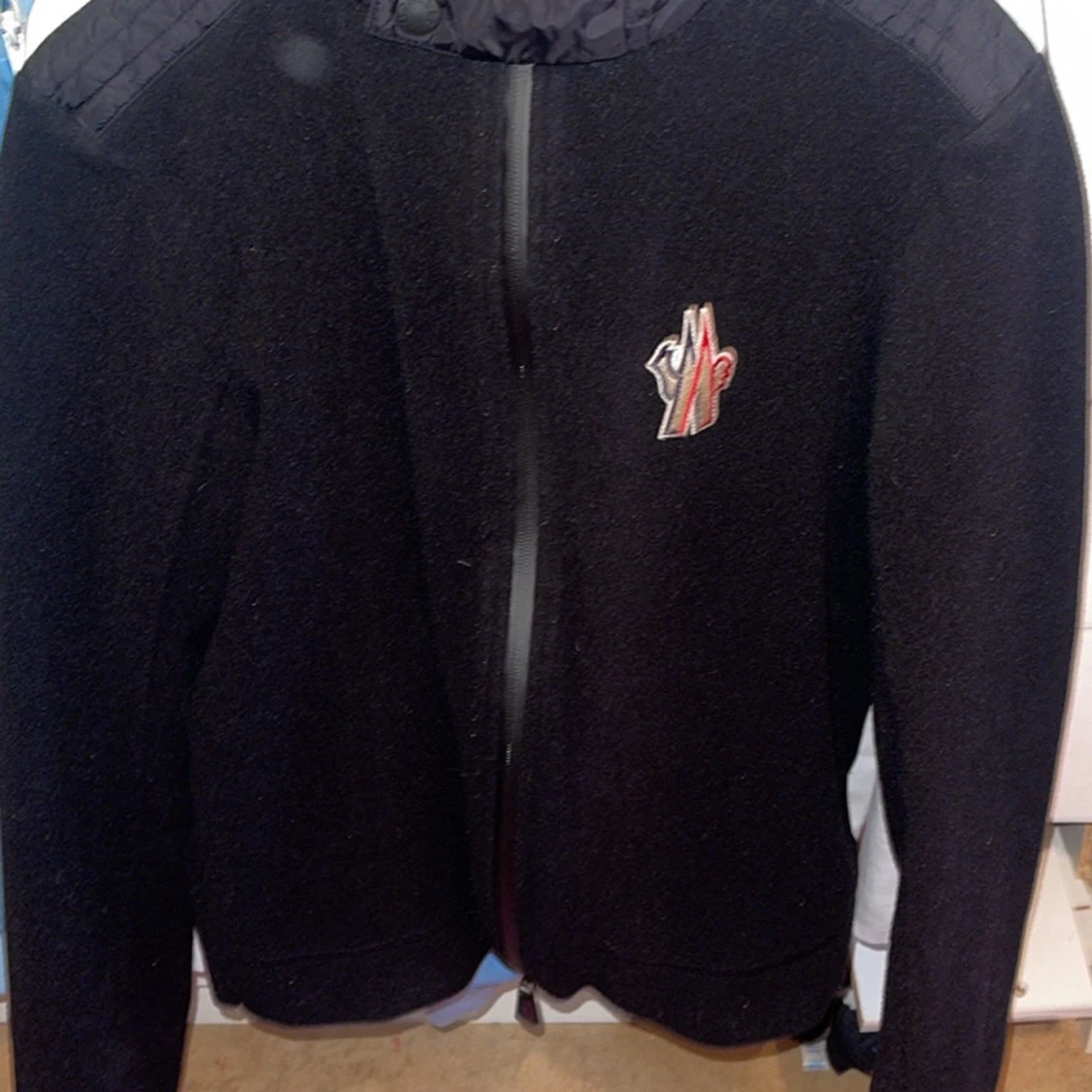 Svart jacka från Moncler med hög krage och hel dragkedja framtill. Jackan har ett broderat Moncler-märke på bröstet och quiltade detaljer på axlarna. Tillverkad i ett mjukt material som känns både sportigt och stilrent. Perfekt för dig som gillar clean och exklusiv look.