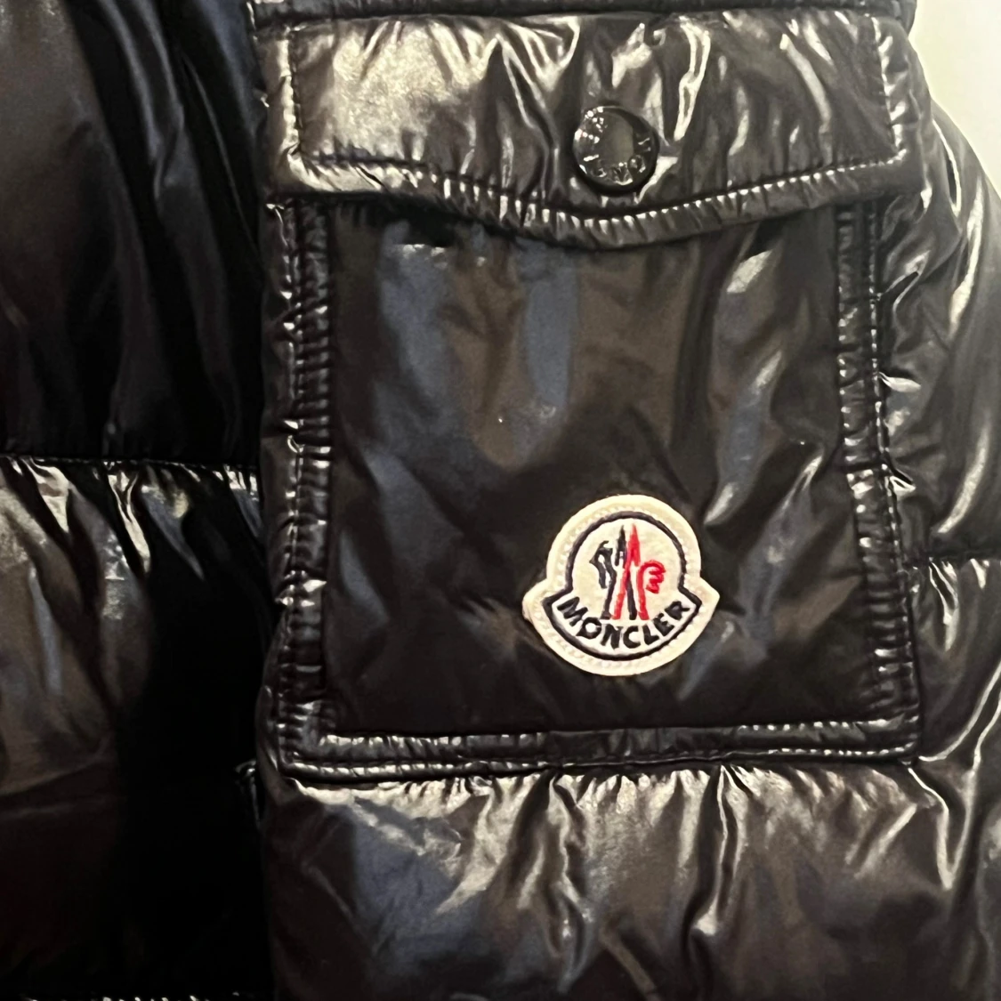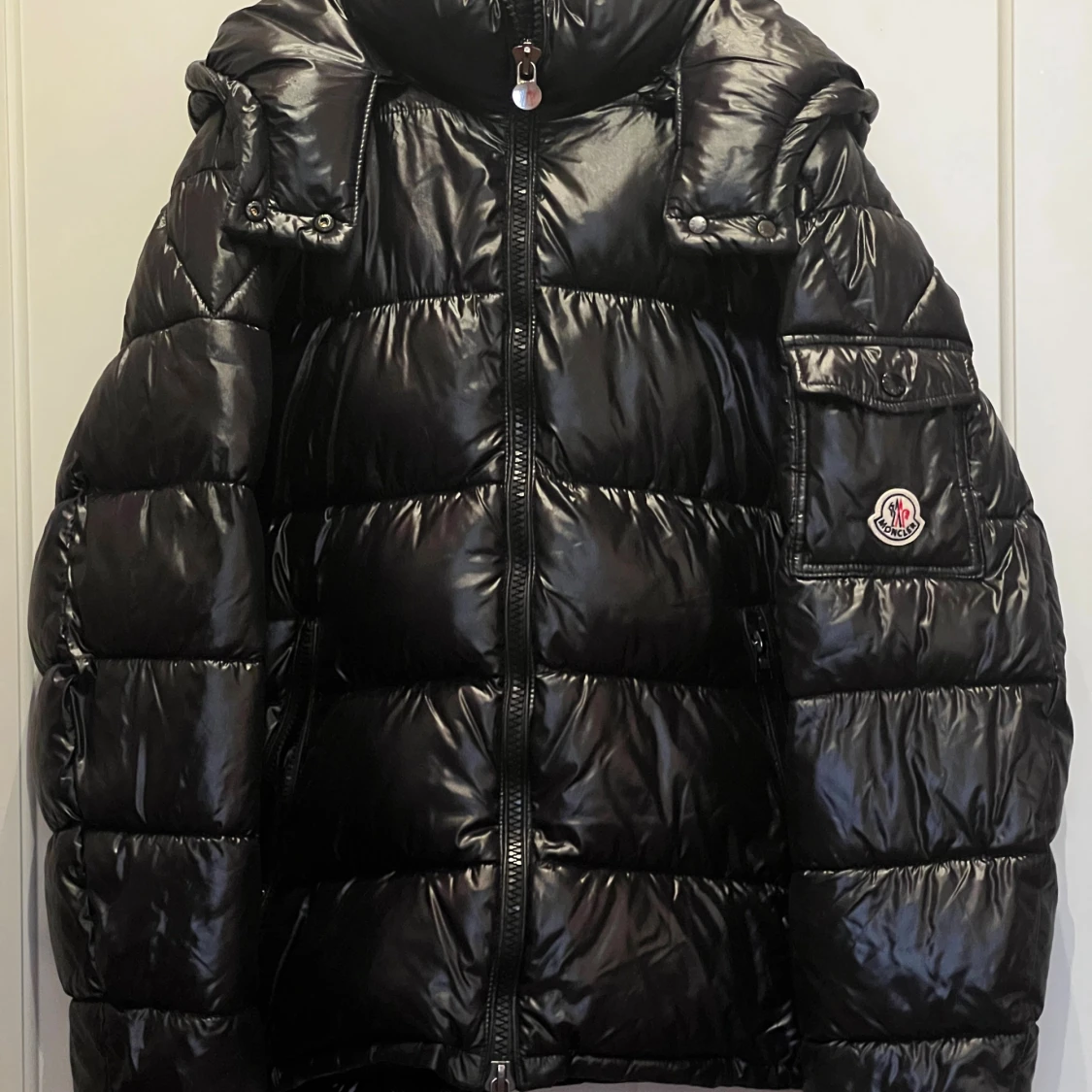 Säljer en svart, glansig pufferjacka från Moncler i storlek M. Jackan har dunfyllning, hög krage, dragkedja framtill och en ikonisk Moncler-logga på ärmen. Perfekt för kalla dagar och har en riktigt fet streetstil.