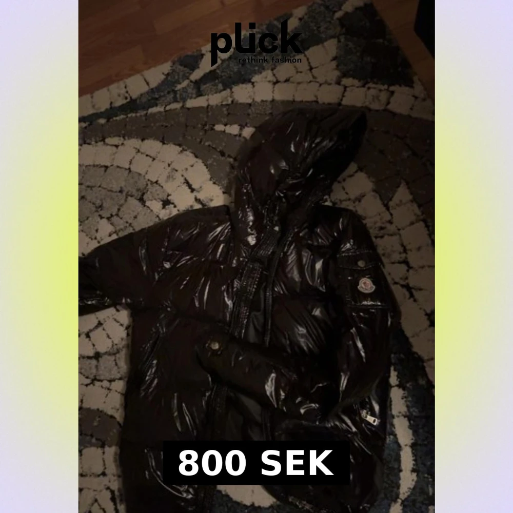 Säljer en svart glansig pufferjacka från Moncler med huva och dragkedja framtill. Jackan har Moncler-logga på ärmen och flera praktiska fickor med dragkedja. Perfekt för kalla dagar när du vill ha både stil och värme.