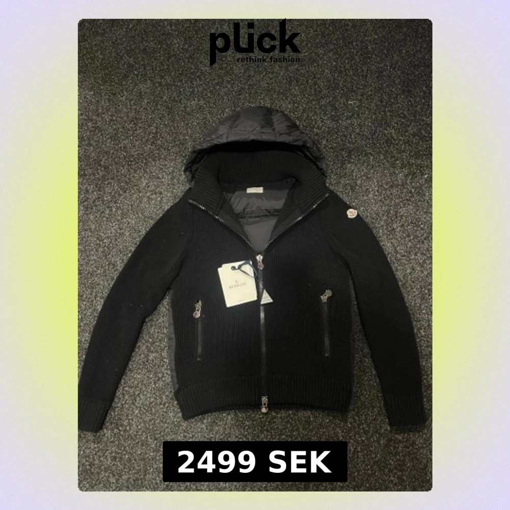 Svart pufferjacka från Moncler med stickade ärmar och quiltad kropp. Jackan har en stor huva, två dragkedjeförsedda fickor och ribbade muddar. Materialmix av dun och stickad polyester ger både värme och stil. Perfekt för dig som vill ha en snygg och funktionell jacka😊