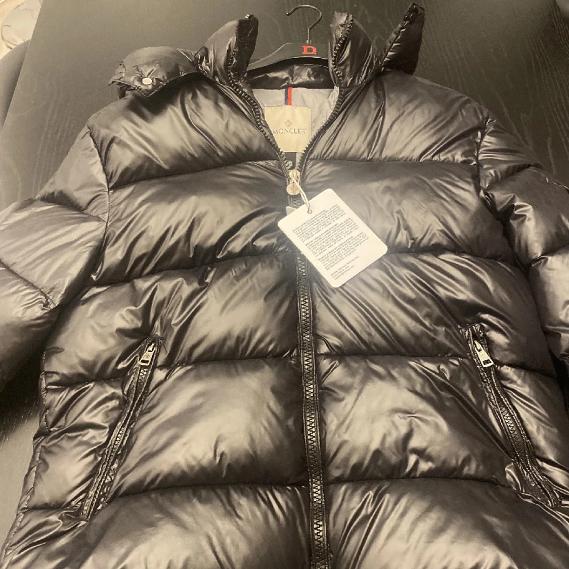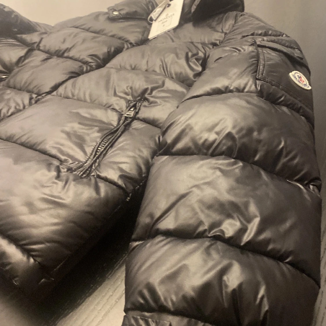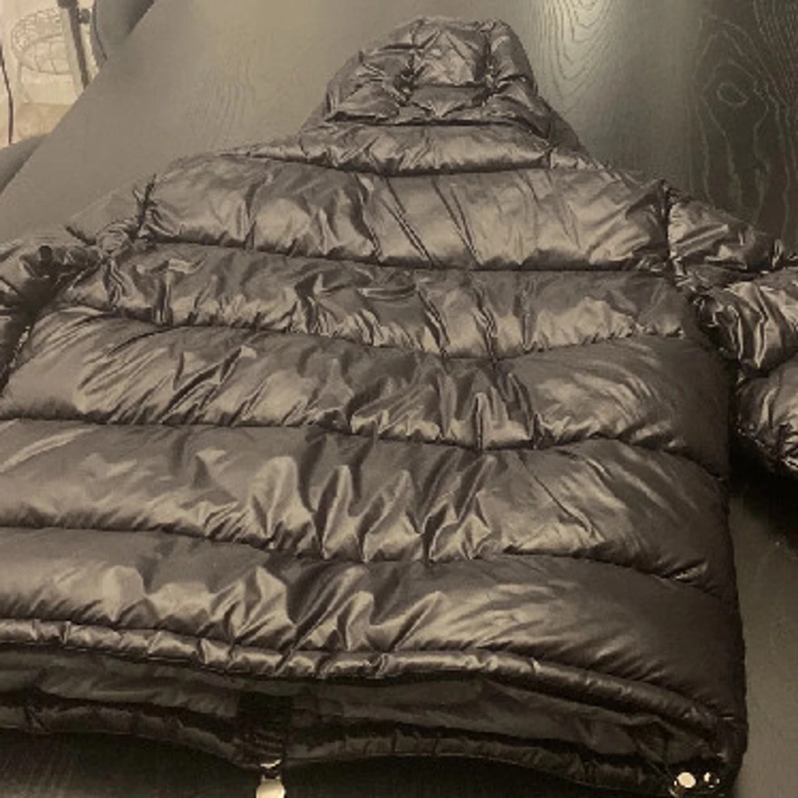 Snygg svart pufferjacka från Moncler med glansig finish, huva och två dragkedjefickor framtill. Jackan har en klassisk Moncler-logga på ärmen och quiltad design som ger en riktigt fet vinterlook. Perfekt för dig som vill hålla stilen när det är kallt ute.