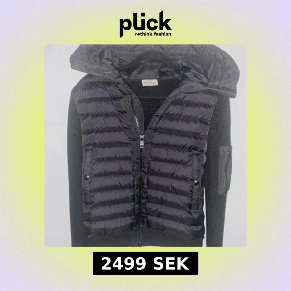 Svart pufferjacka från Moncler med stickade ärmar och vadderad kropp. Jackan har huva, två fickor med knappstängning och dragkedja framtill. Snyggt quiltad design och Moncler-logga på ärmen. Perfekt för dig som gillar exklusiva streetwear-vibbar.
