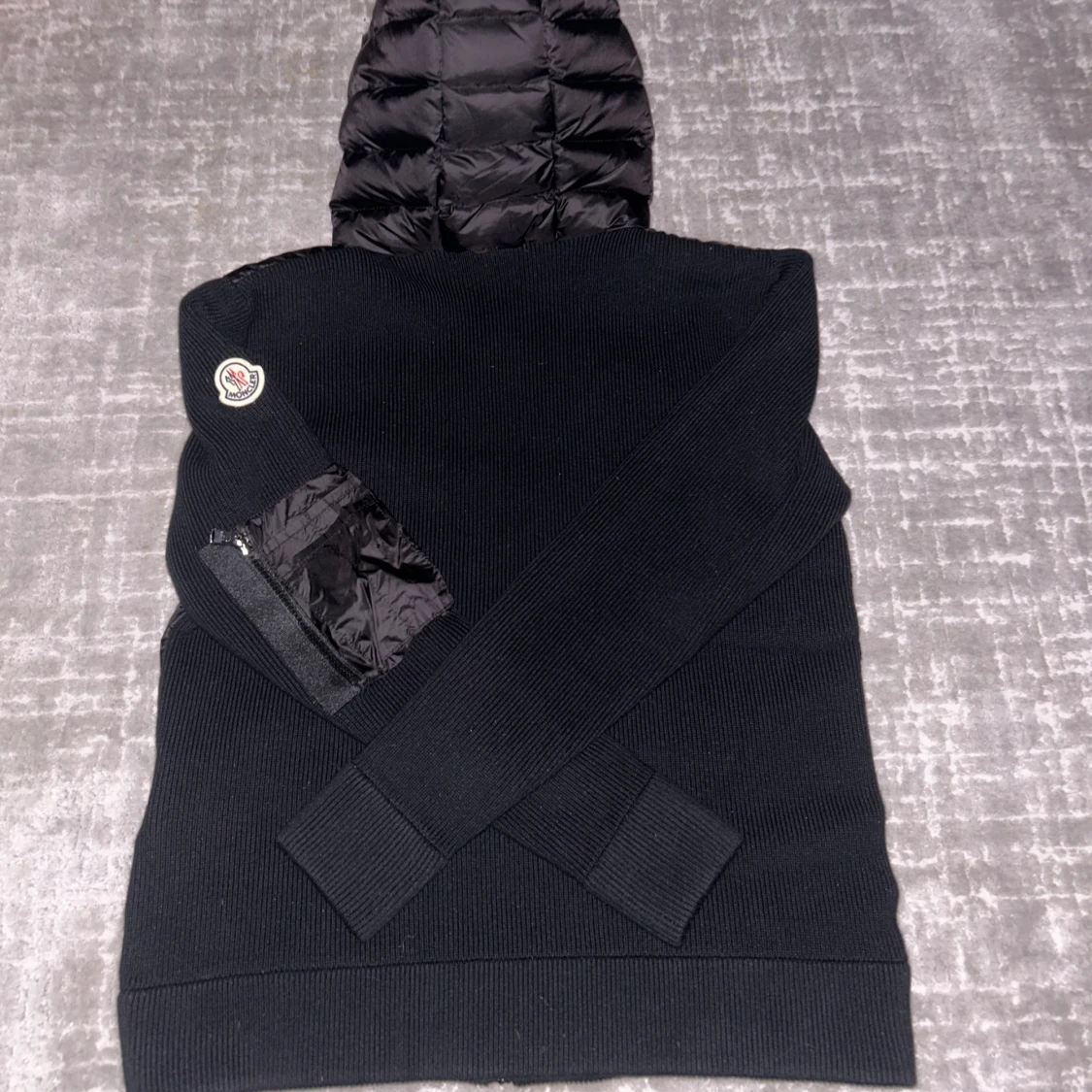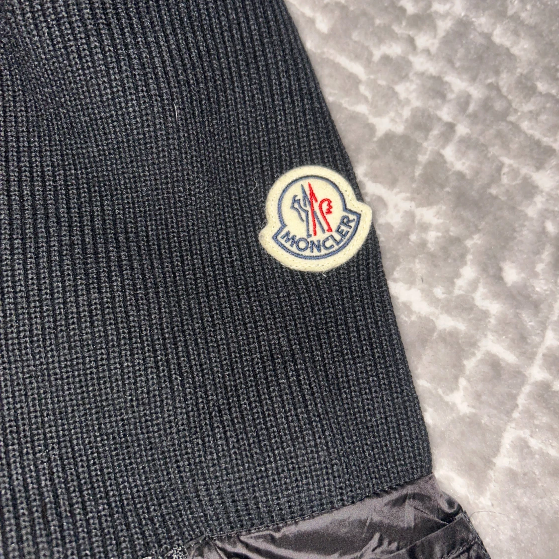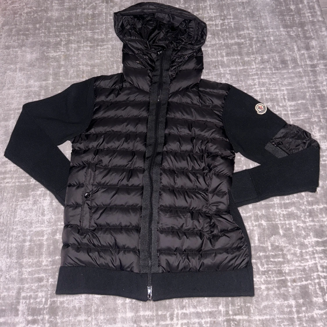 Svart pufferjacka Moncler med stickade ärmar och quiltad kropp. Jackan har huva, dragkedja framtill och Moncler-logga på vänster ärm. Materialmix med dun och stickad polyester ger en schysst look. Perfekt för dig som gillar street och premium.