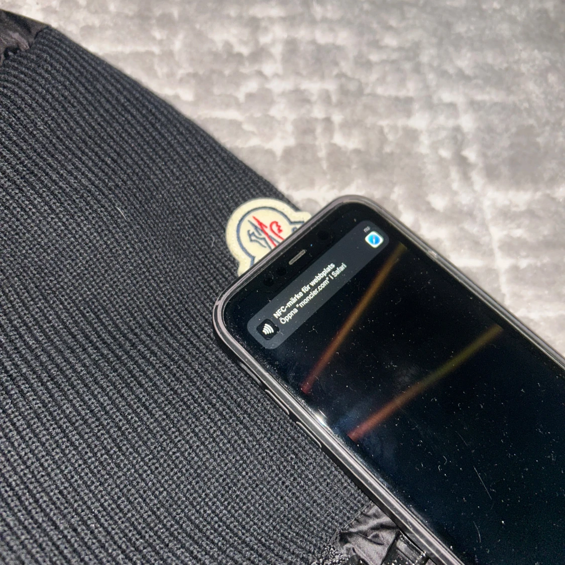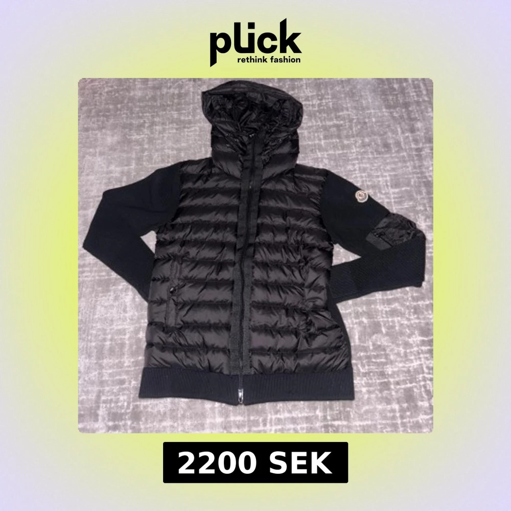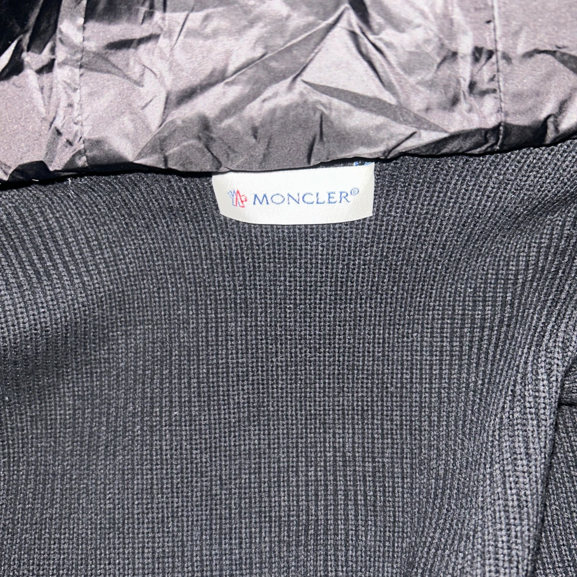 Svart pufferjacka Moncler med stickade ärmar och quiltad kropp. Jackan har huva, dragkedja framtill och Moncler-logga på vänster ärm. Materialmix med dun och stickad polyester ger en schysst look. Perfekt för dig som gillar street och premium.