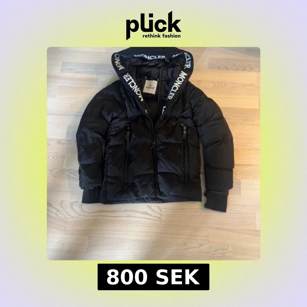 Snygg svart pufferjacka från Moncler med stor huva och tydlig logga på huvkanten. Jackan har två dragkedjeförsedda fickor framtill, ribbade muddar och klassisk Moncler-patch på ärmen. Perfekt för kalla dagar och riktigt street i stilen.