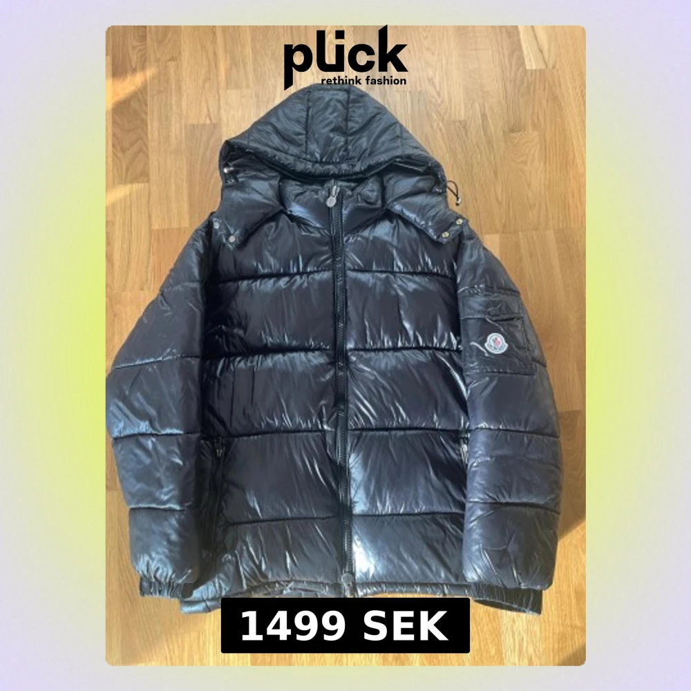 Snygg svart pufferjacka från Moncler med glansig finish och huva. Jackan har dragkedja framtill, två fickor med dragkedja och Moncler-logga på ärmen. Perfekt för kalla dagar och riktigt skön att bära. Klassisk och stilren design. Vid frågor och funderingar hör gärna av er pris ej hugget i sten.