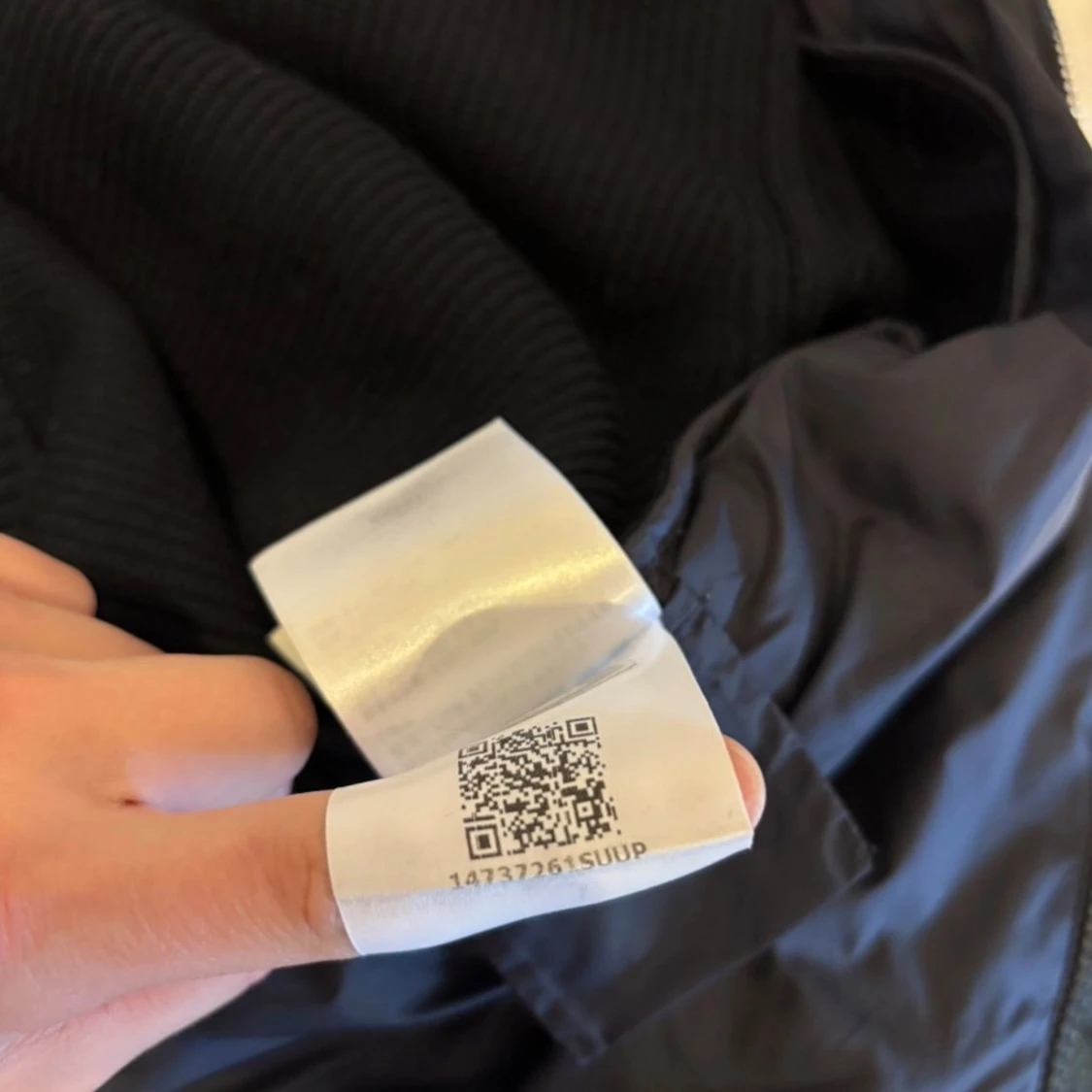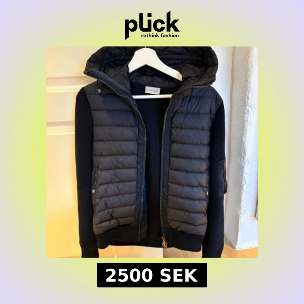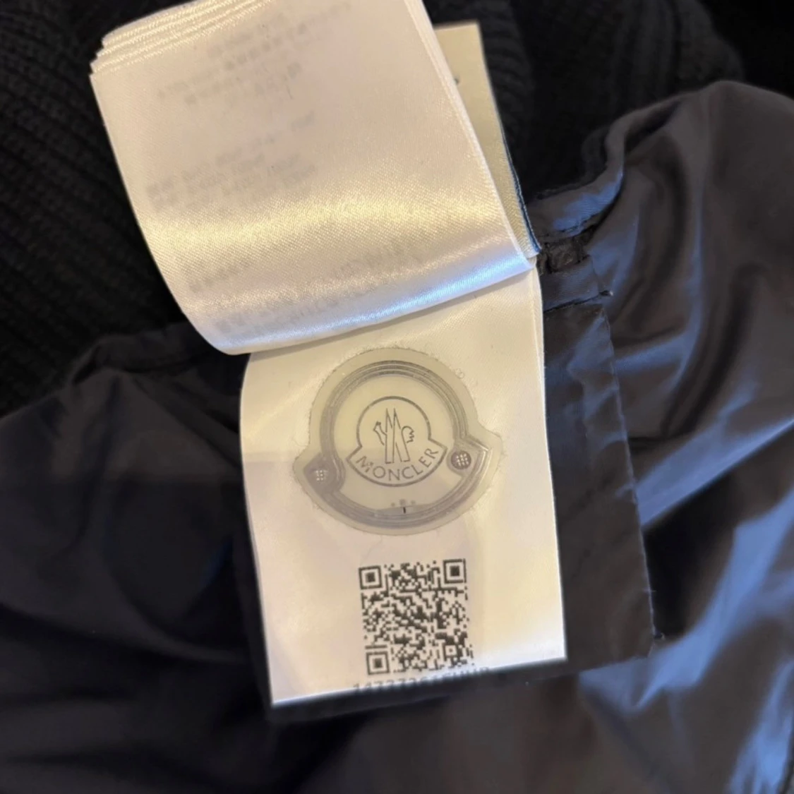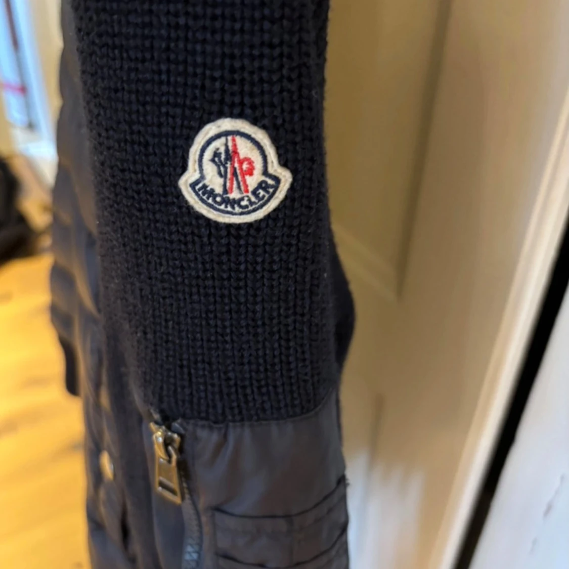 Svart pufferjacka från Moncler med stickade ärmar och vadderad front. Jackan har huva, dragkedja och Moncler-logga på ärmen. Perfekt för dig som vill ha en snygg och sportig look med premiumkänsla. Kan sänka vid snabb affär