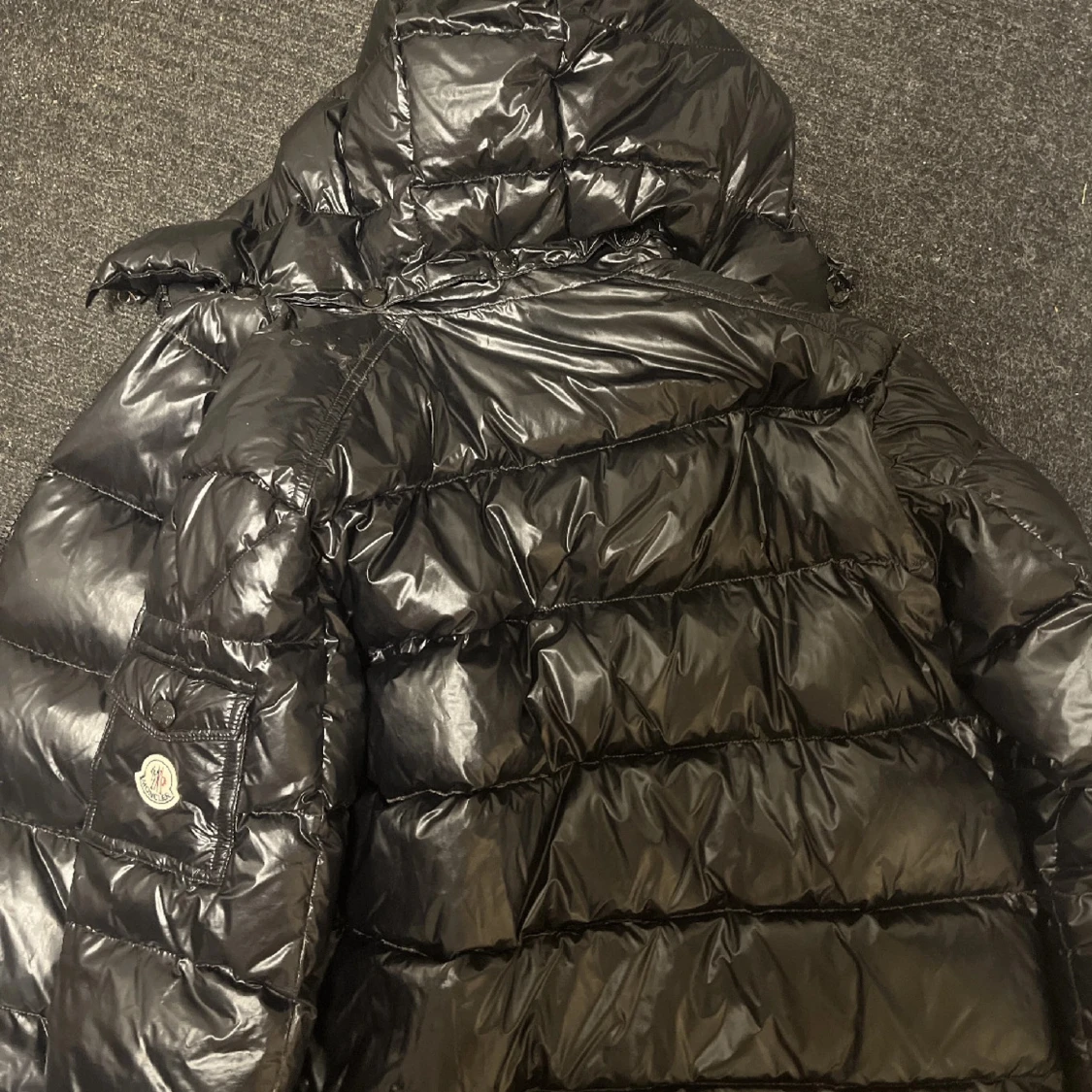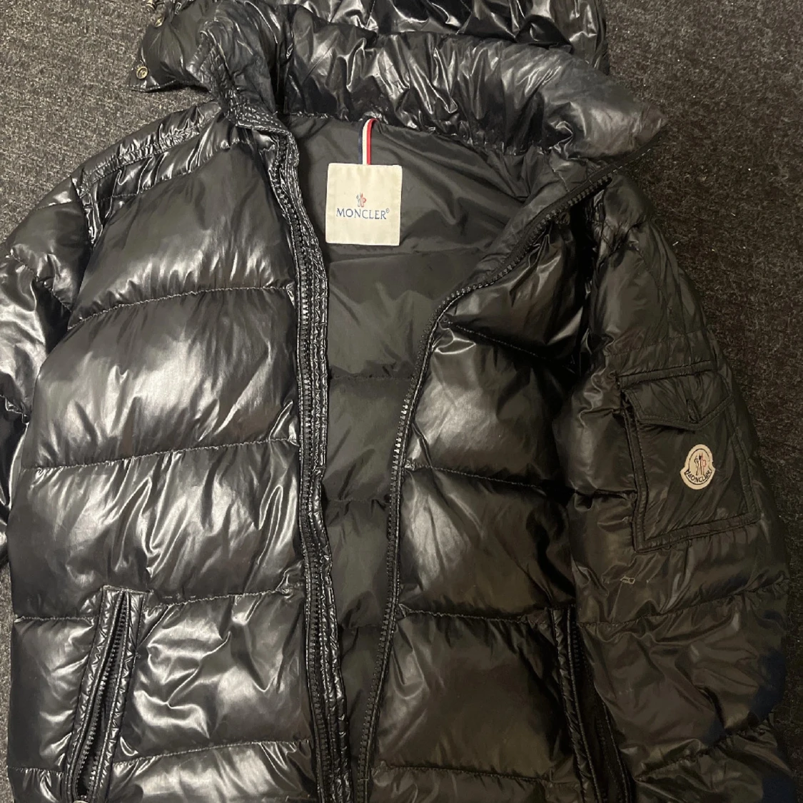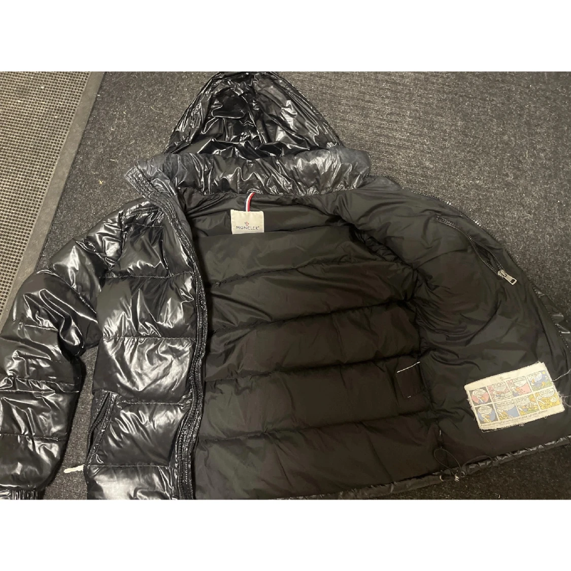 Säljer en svart pufferjacka från Moncler med glansig finish och huva. Jackan har dragkedja framtill, fickor med dragkedja och en patch med Moncler-logga på ärmen. Perfekt för kalla dagar och har en riktigt schysst oversized vibe.
