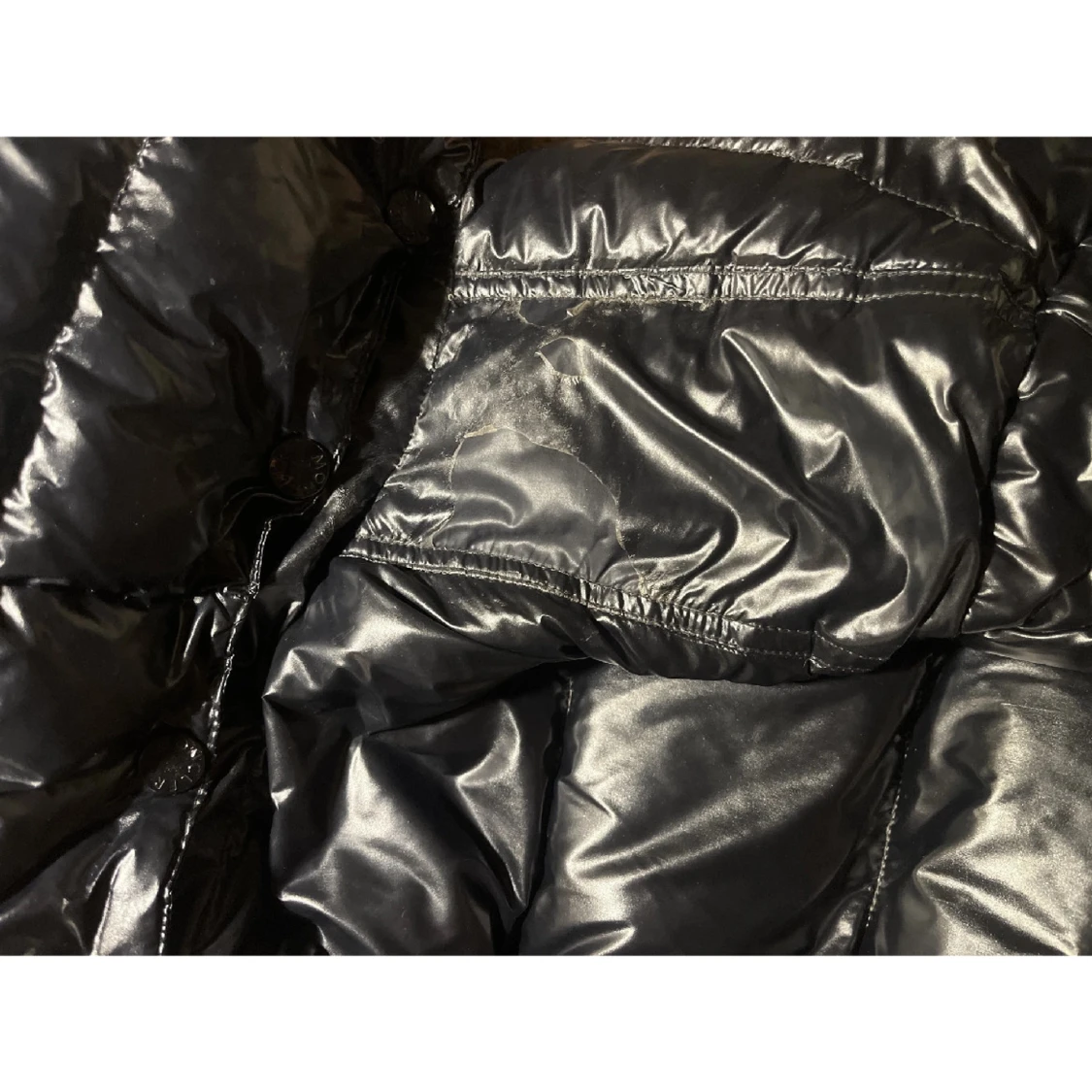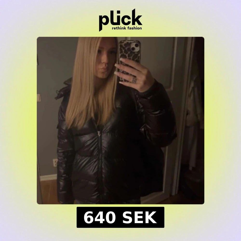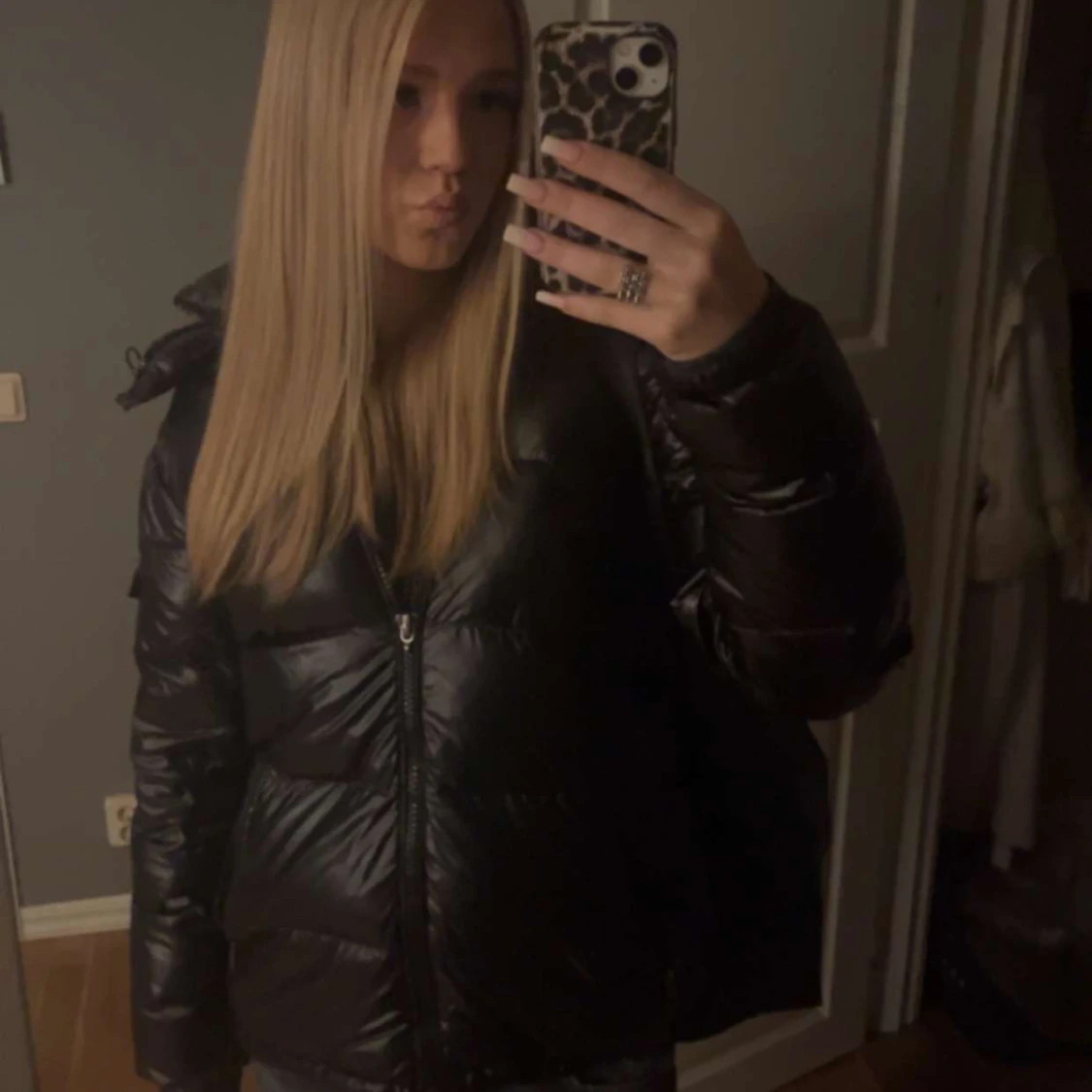 Säljer en svart pufferjacka från Moncler med glansig finish och huva. Jackan har dragkedja framtill, fickor med dragkedja och en patch med Moncler-logga på ärmen. Perfekt för kalla dagar och har en riktigt schysst oversized vibe.