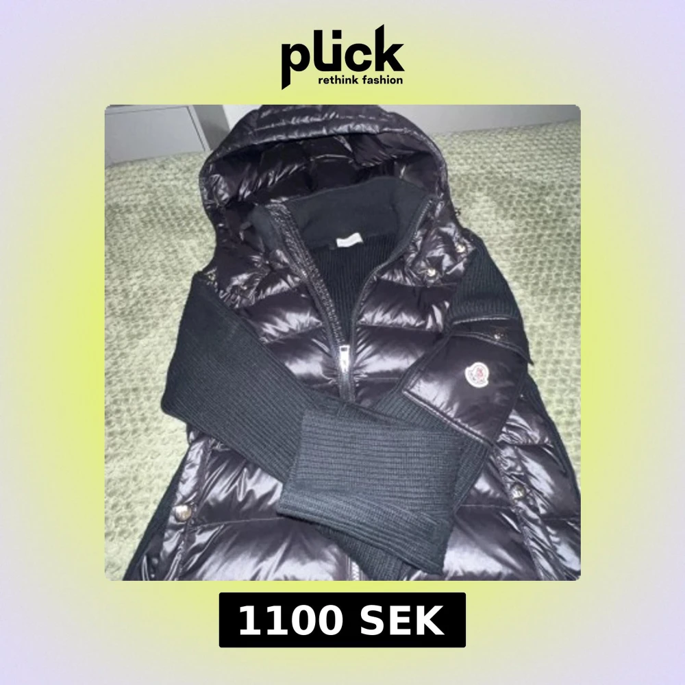 Säljer en svart cardigan från Moncler med stickade ärmar och detaljer. Jackan har en stor, vadderad huva och dragkedja framtill. Moncler-logga på ärmen och snygga ribbade muddar. Perfekt för dig som vill ha en cool och varm jacka med streetkänsla. Är 175cm och väger 67 kg och passar bra/