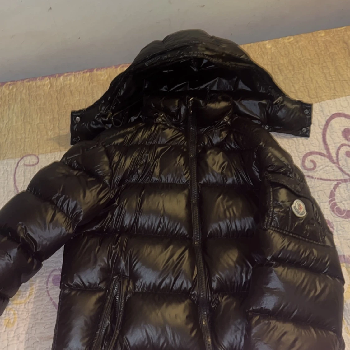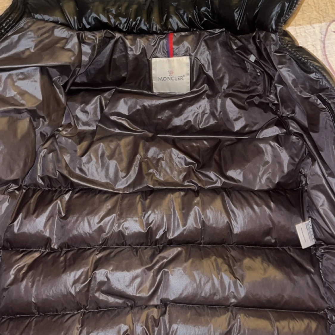 Säljer en svart, glansig pufferjacka från Moncler med huva och dragkedja framtill. Jackan har klassisk Moncler-logga på ärmen och stora quiltade partier som ger en riktigt fet vinterlook. Perfekt för dig som vill ha både stil och värme under kalla dagar.