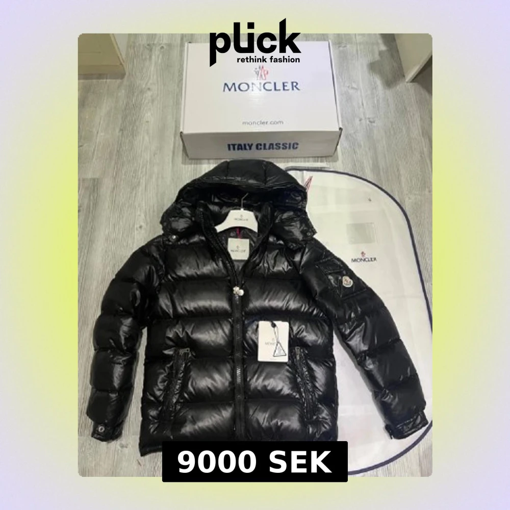 Svart pufferjacka från Moncler med glansig finish, huva och klassisk logga på ärmen. Jackan har dragkedja framtill, två fickor med dragkedja och quiltad design. Perfekt för kalla dagar och riktigt snygg streetstil.