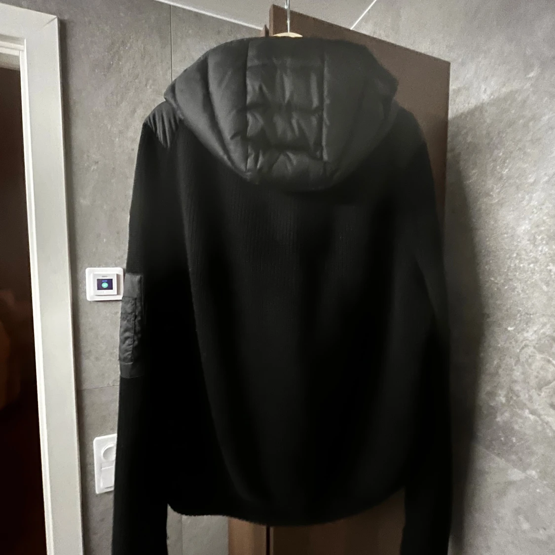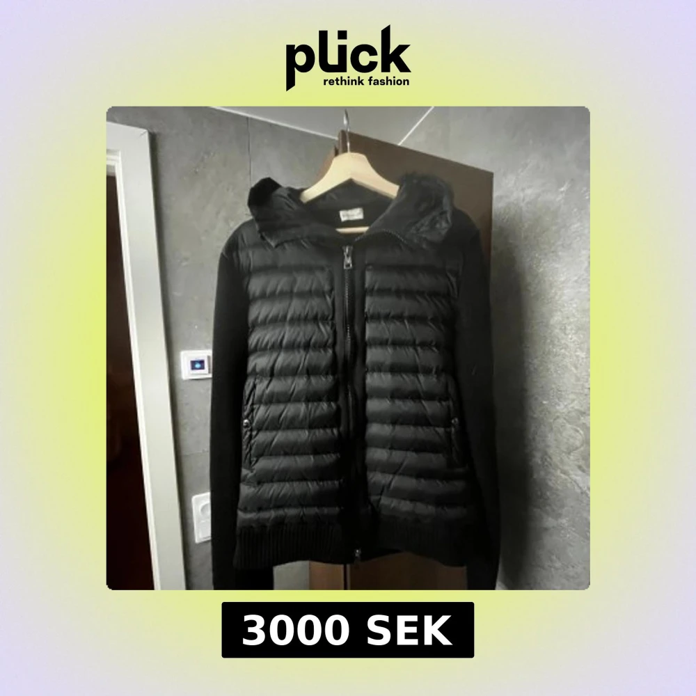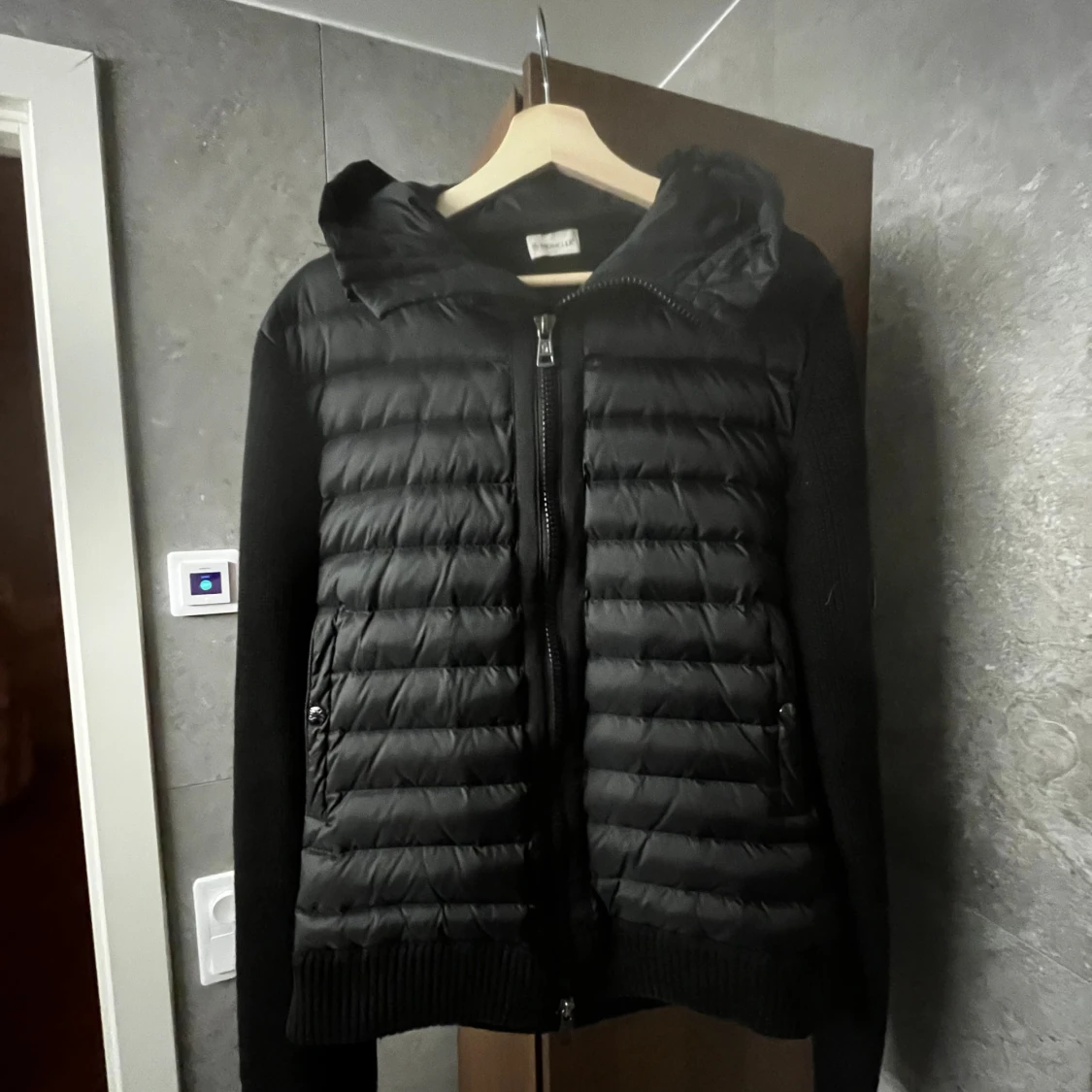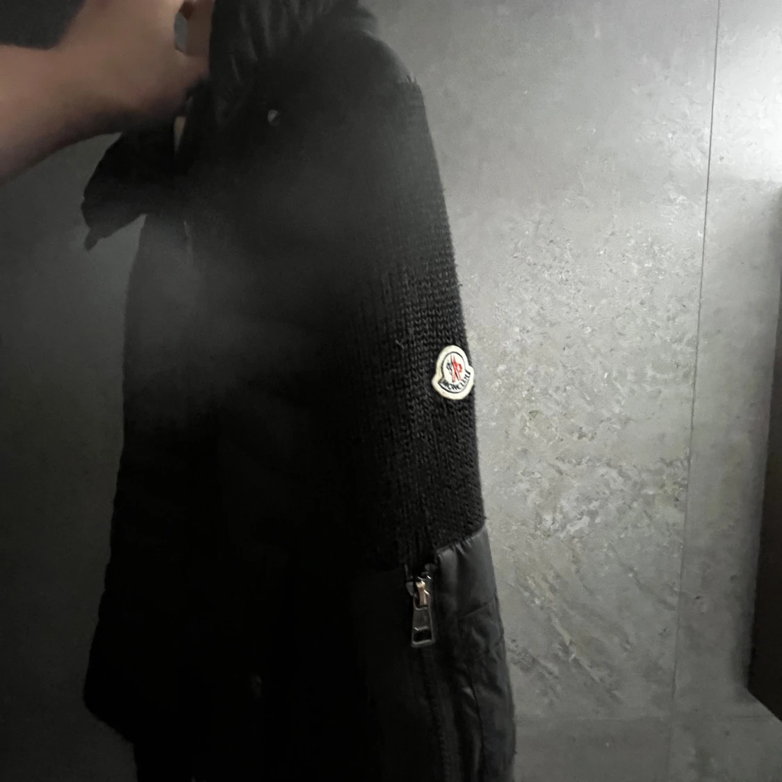 Svart pufferjacka från Moncler med stickade ärmar och quiltad front. Jackan har huva, dragkedja framtill och två fickor med dragkedja. Moncler-logga på ena ärmen. Perfekt för kyliga dagar. Jackan är i väldigt bra skick utan defekter och såklart äkta.