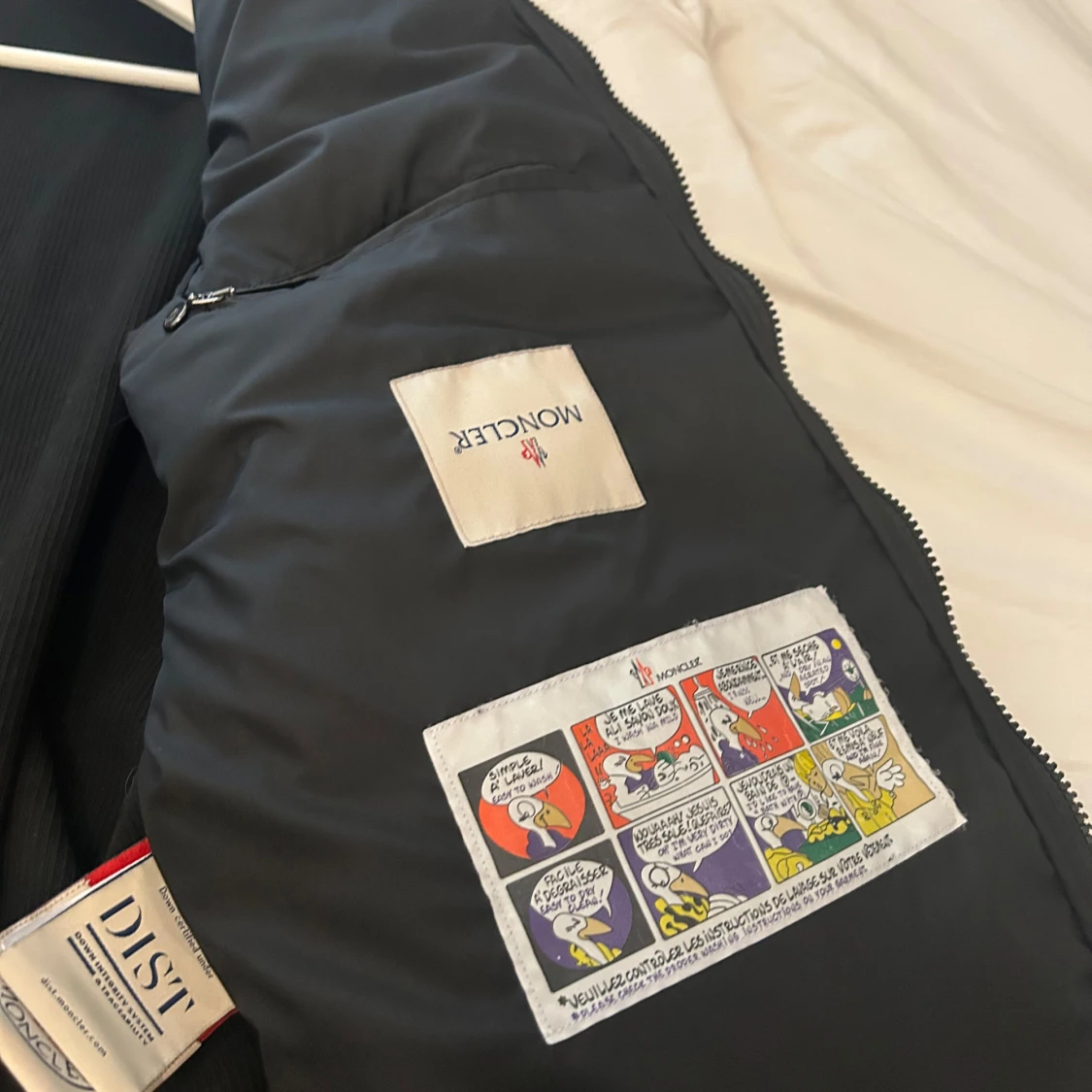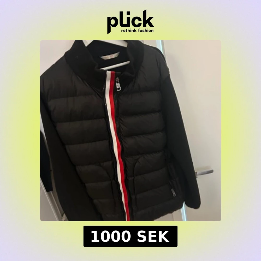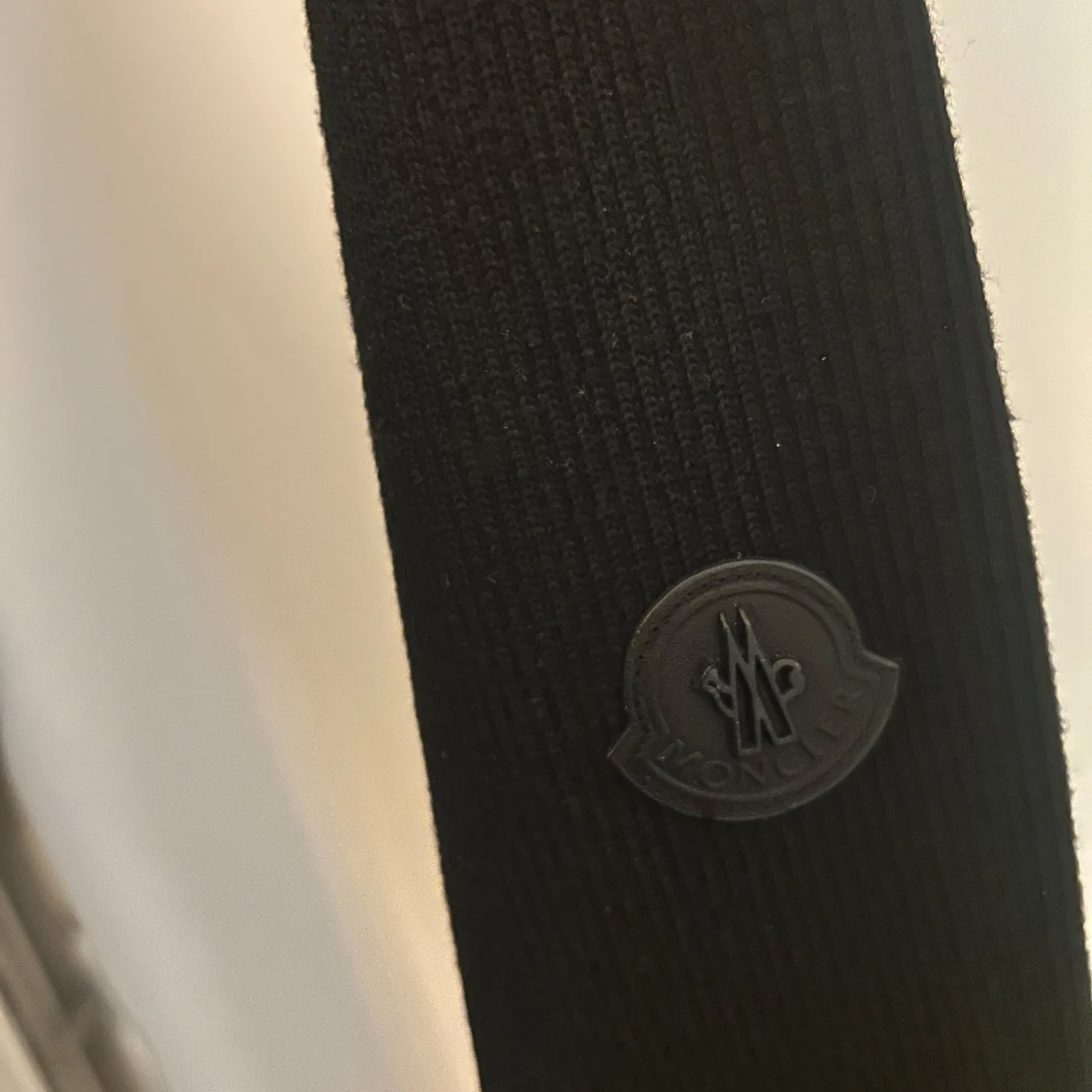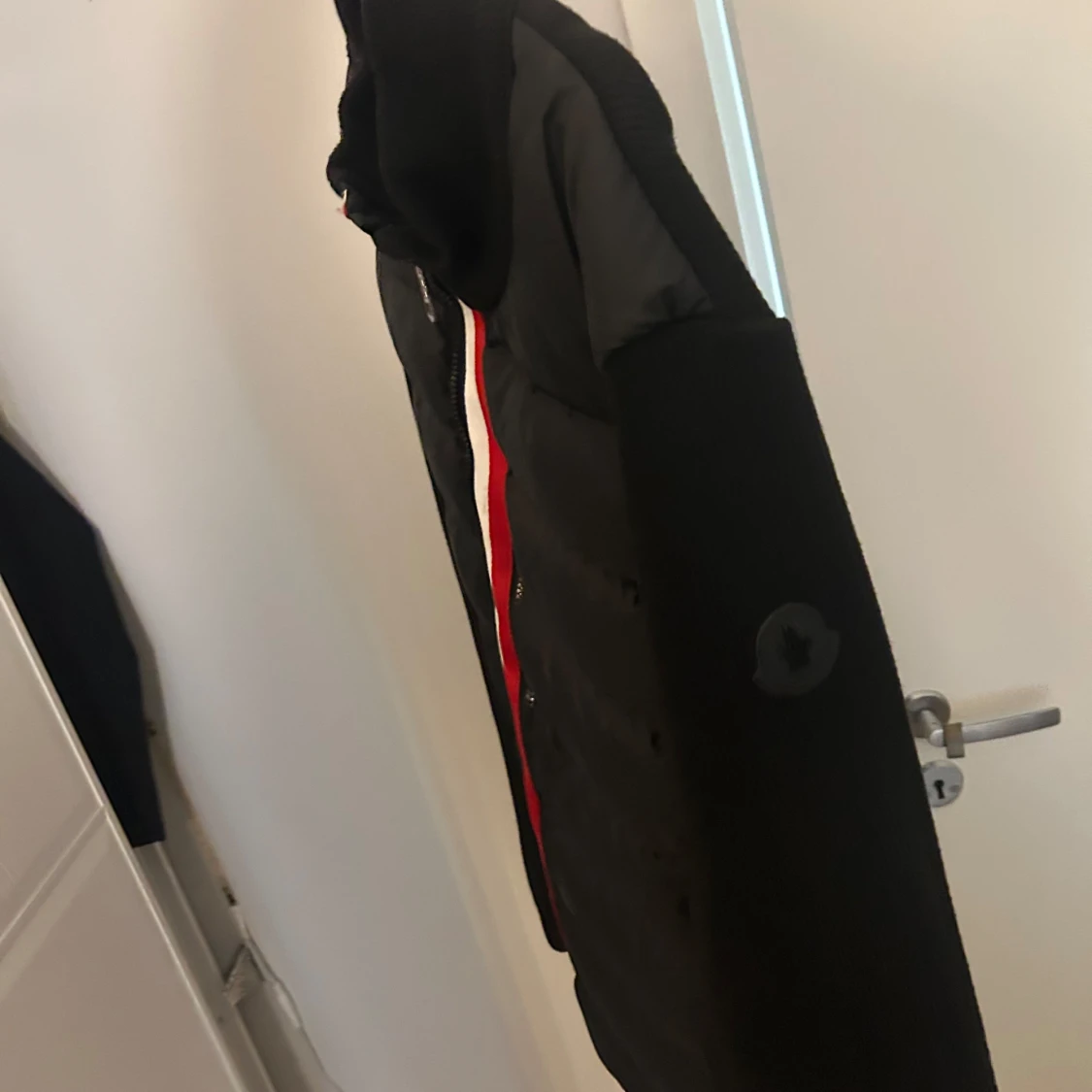 Snygg svart pufferjacka från Moncler med stickade ärmar och coolt Moncler-märke på armen. Jackan har en dragkedja framtill med röd och vit detalj som ger en sportig vibe. Perfekt för dig som vill ha en stilren och trendig look under kyliga dagar. Xl passar L 185-190 cm
