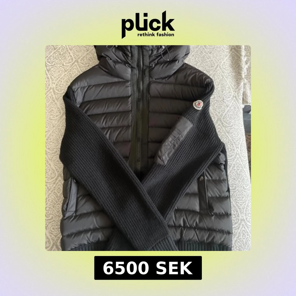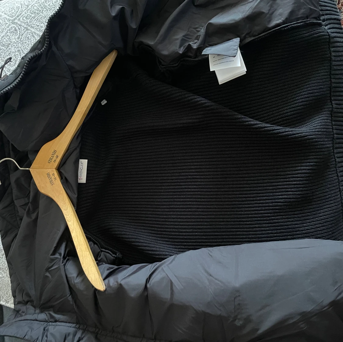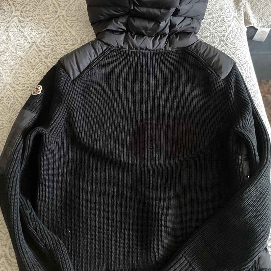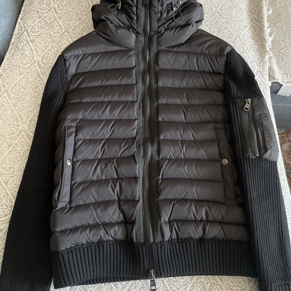 Svart pufferjacka från Moncler med stickade ärmar och rygg, quiltad framsida och huva. Jackan har dragkedja framtill, fickor med tryckknappar och en extra ficka med dragkedja på ärmen. Klassisk Moncler-logga på vänster ärm. Perfekt för kyliga dagar.