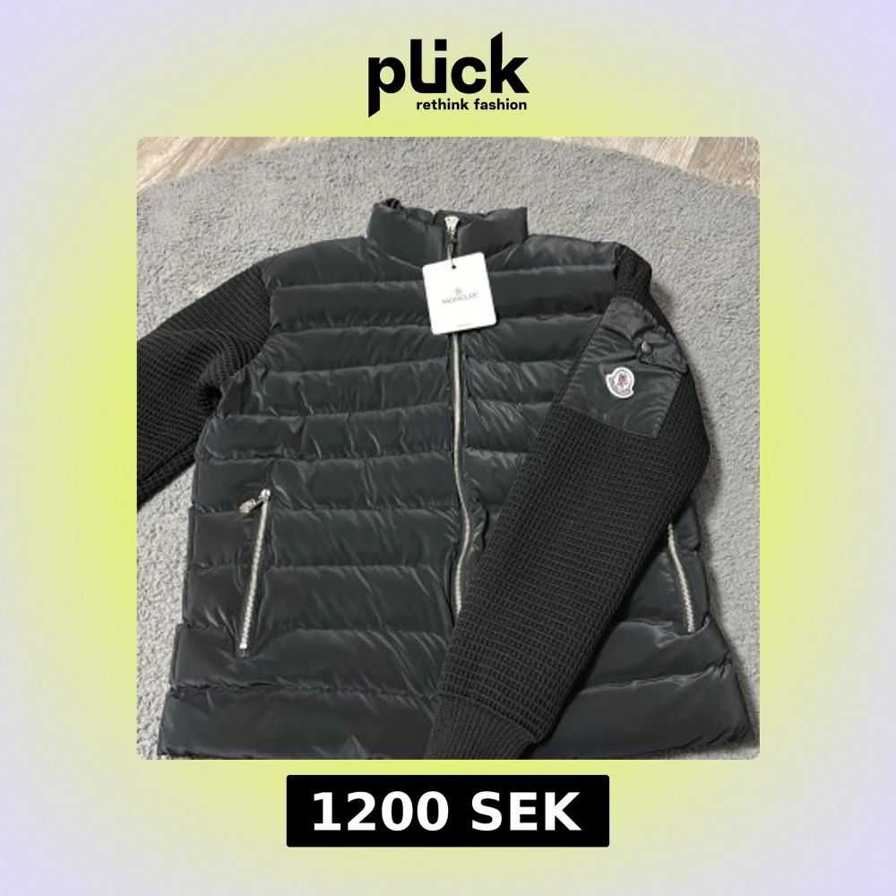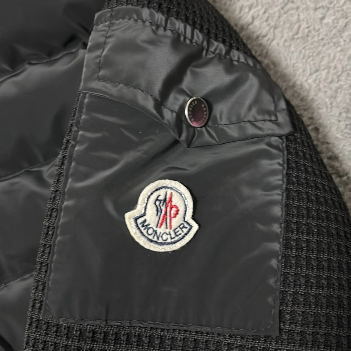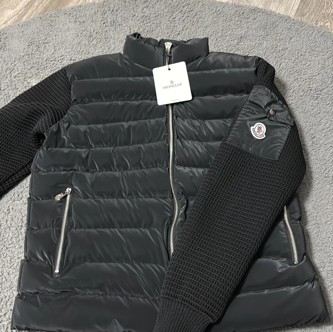 Svart pufferjacka från Moncler med stickade ärmar och quiltad kropp. Jackan har dragkedja framtill, två dragkedjefickor och Moncler-logga på ena ärmen. Materialmix av polyester och stickat ger en modern look. Perfekt för kyliga dagar.